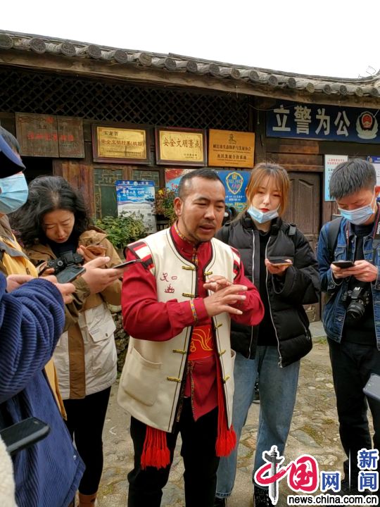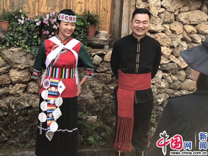玉湖村居民身着民族服饰在村内与游客打招呼。中国网记者严星/摄