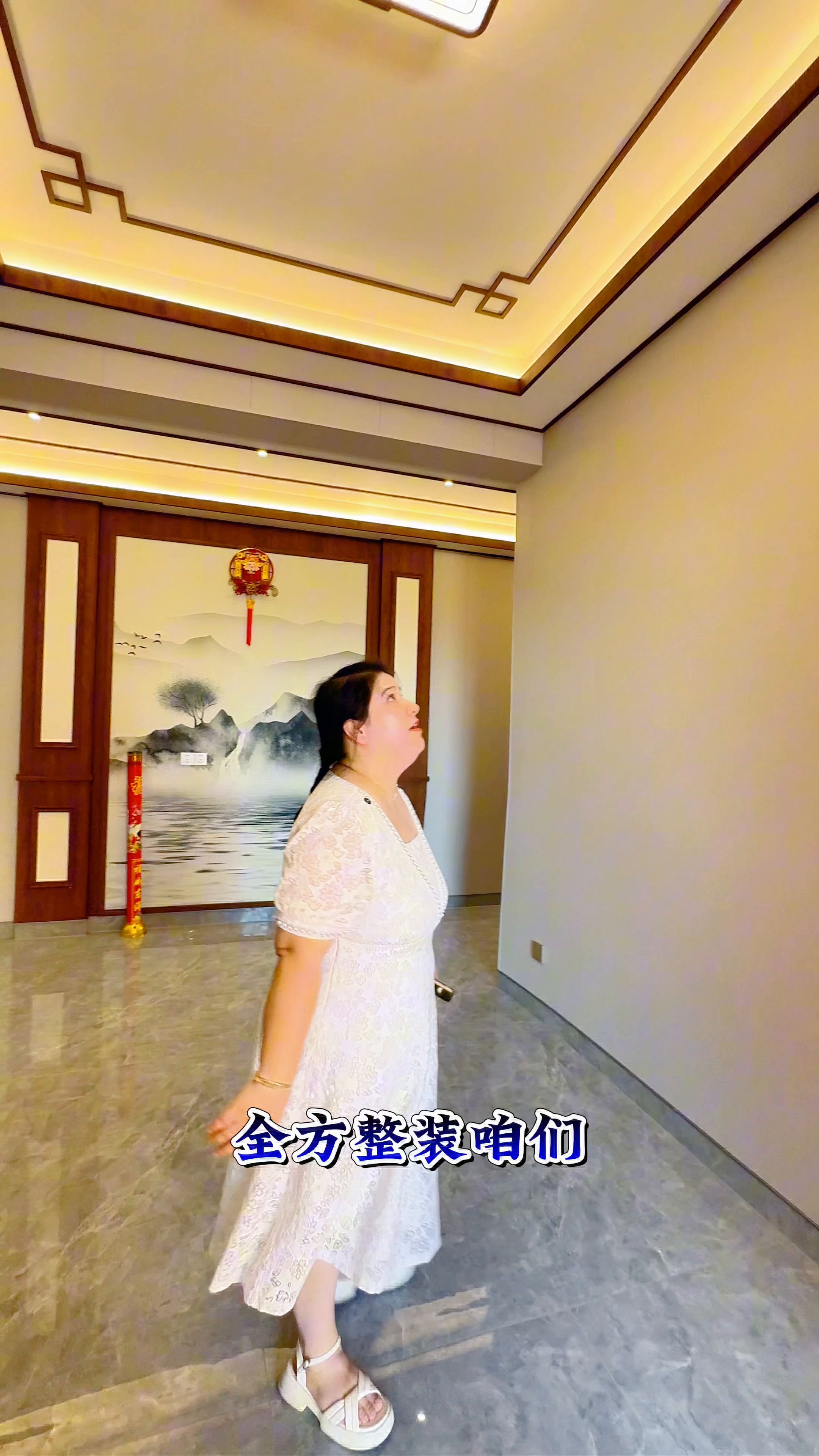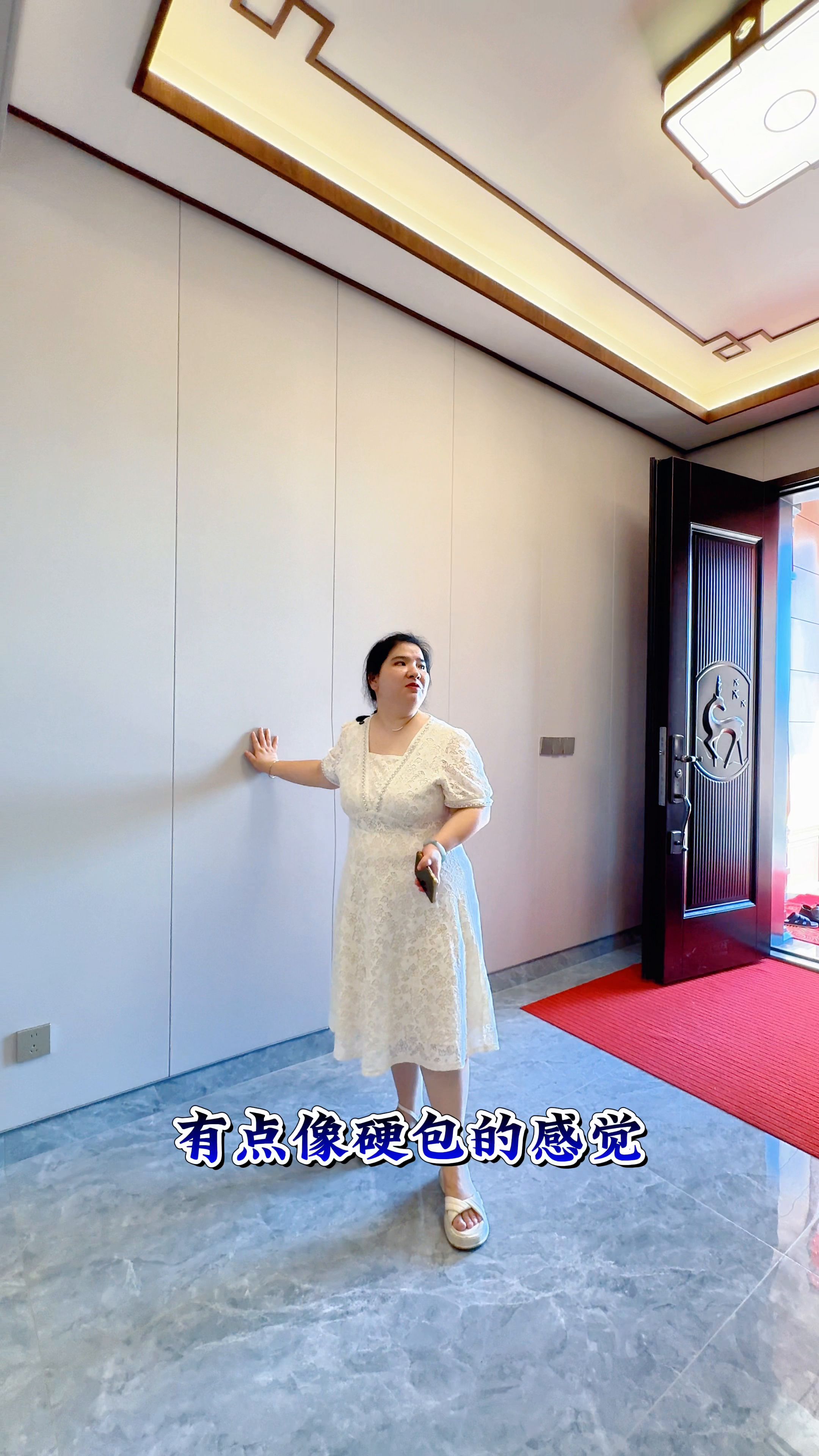 到这边来看一下,入户门也很大气,全方整装托斯卡纳的护墙板。可以看到这个是丝织驼的威风板,这边是端顶的定制画,很漂亮。其实来到这里,这个是来到这里,让我正常就挑高的顶。其实别墅真的要用托斯卡纳的护墙板,又干净又整洁,使用寿命又长,又大气。用周老师的话说就是气派,不管外面气派,里面也很气派。