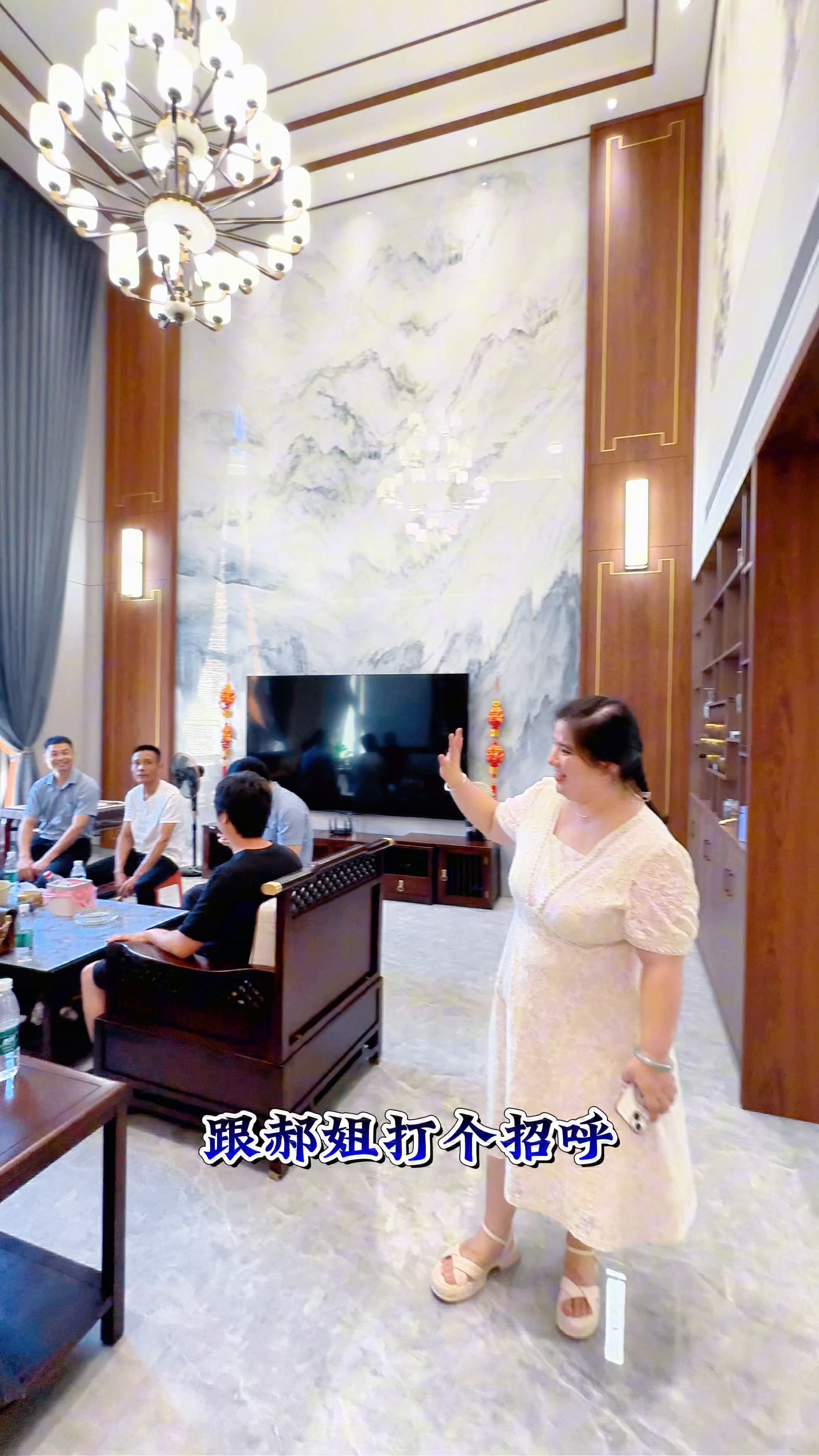 别墅外面气派,里面还是差那么点意思。看一下郝姐,跟郝姐打个招呼,今天我是陪老板来蹭蹭视频的。这边是餐厅,这边就比较简单一点,但是我觉得还是很舒适,颜色也配的很好。所以我就说设计师是魔法师。为什么说设计师是魔法师?这么高的房子,其实总体造价应该还好。