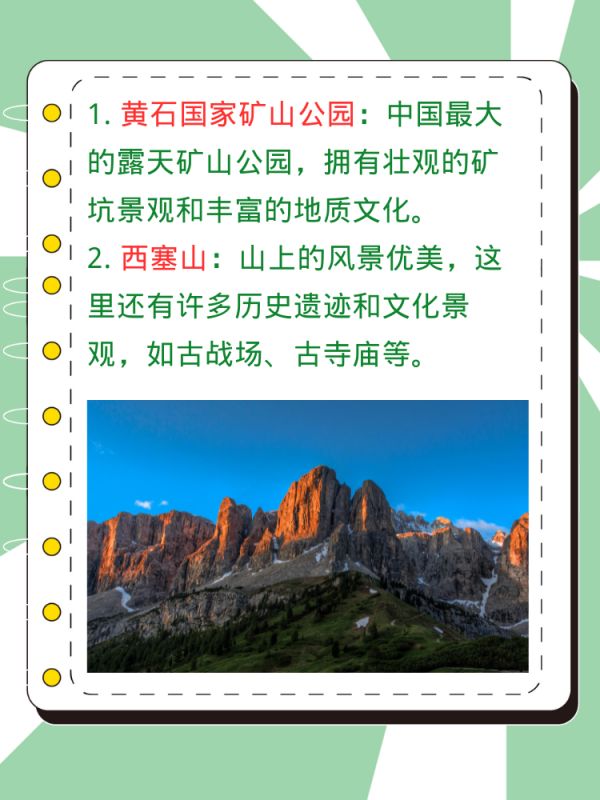 1. 黄石国家矿山公园:作为中国最大的露天矿山公园,这里拥有壮观的矿坑景观和丰富的地质文化。您可以乘坐小火车穿越矿坑,感受工业化时代的遗迹。