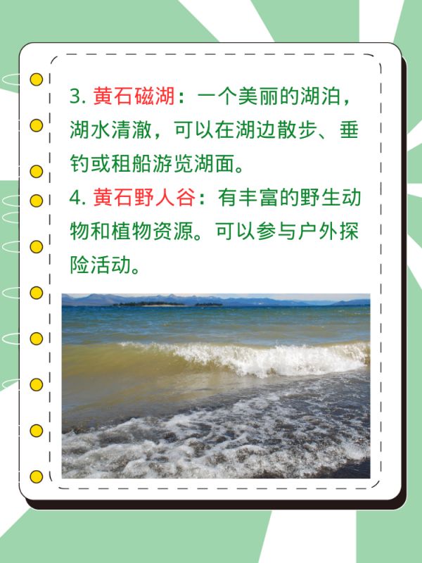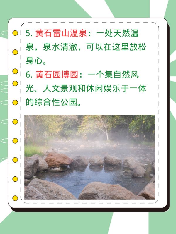 5. 黄石雷山温泉:这是一处天然温泉,泉水清澈、温暖舒适。您可以在这里放松身心,享受温泉带来的舒缓与愉悦。