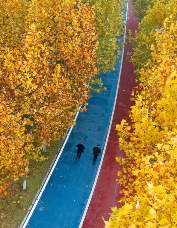 初冬暖阳洒向金黄落叶