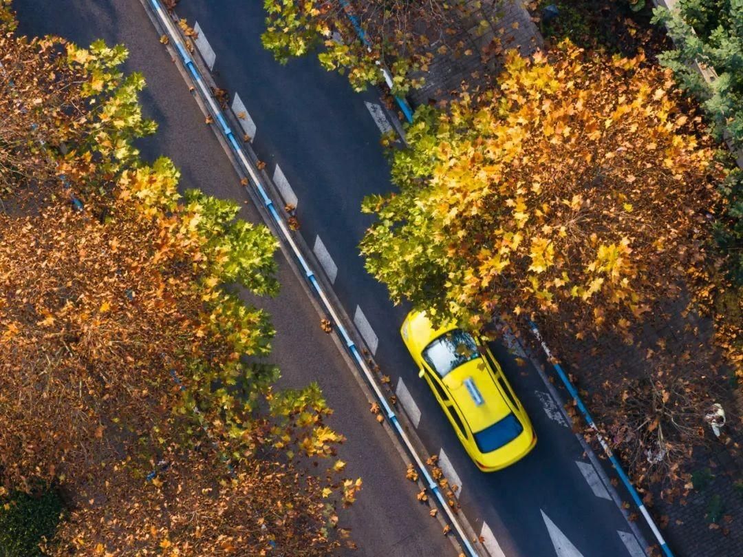 连穿行于梧桐光影之间的小黄车