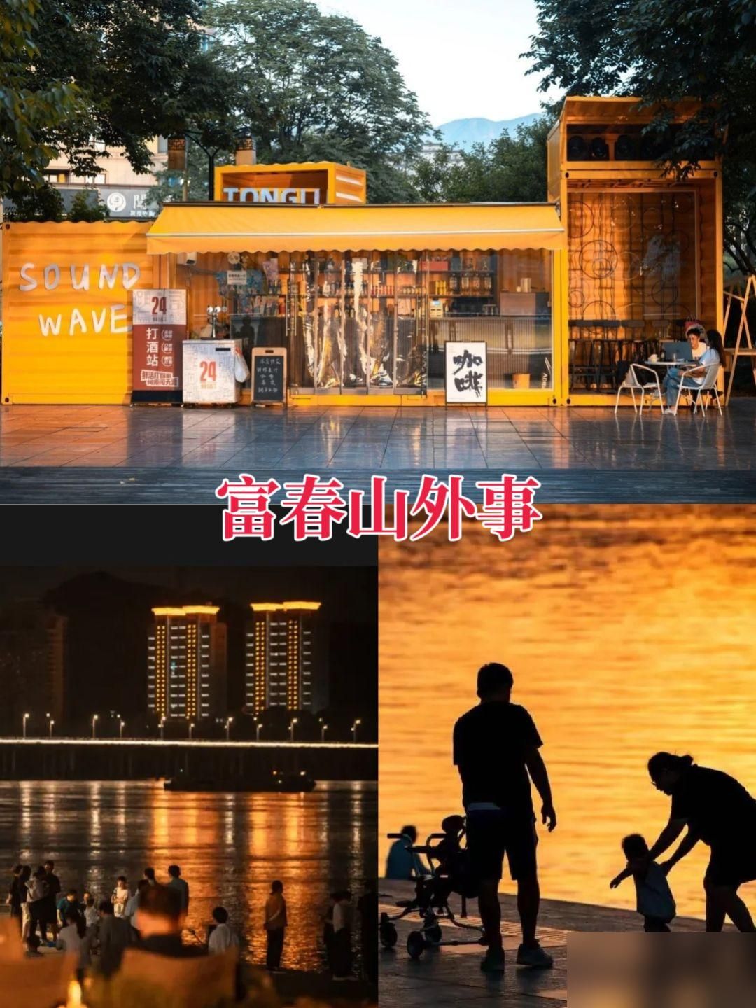夜幕降临,富春江畔的富春山外事开市了,黄色的集装箱档口和夕阳相映成趣,面对桐君山而坐,沐着江风喝着饮品,品味着属于自己的美好时光。