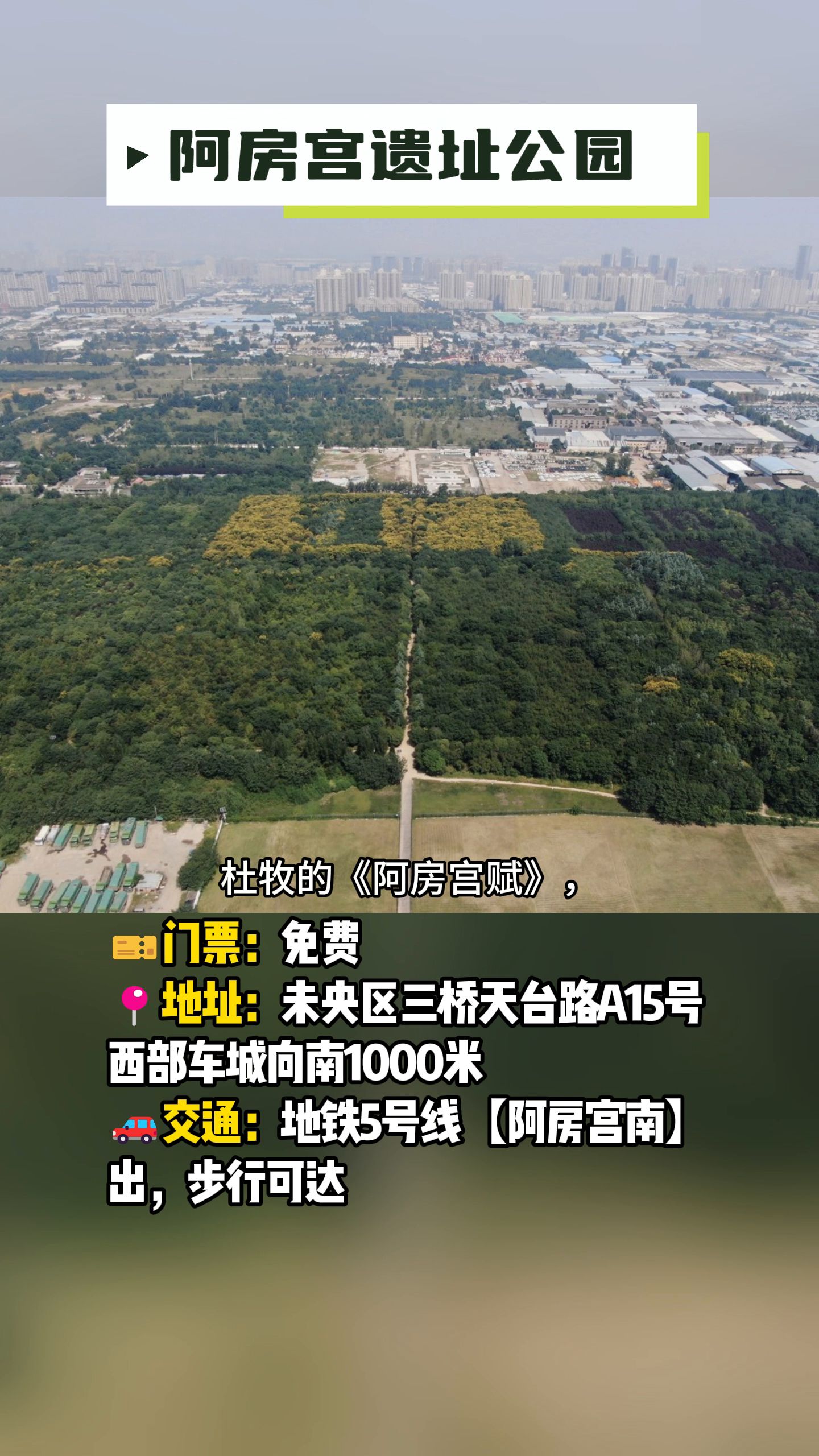 1. 阿房宫遗址公园:门票免费,地址未央区三桥天台路 A15 号,西部车城向南 1000 米,交通地铁 5 号线阿房宫南出,步行可达。被誉为“天下第一宫”,杜牧的《阿房宫赋》相信是很多朋友“认识”这座秦朝宫殿的开始。如今阿房宫前殿遗址的原貌完整保护了起来,作为公园供市民休闲娱乐。
