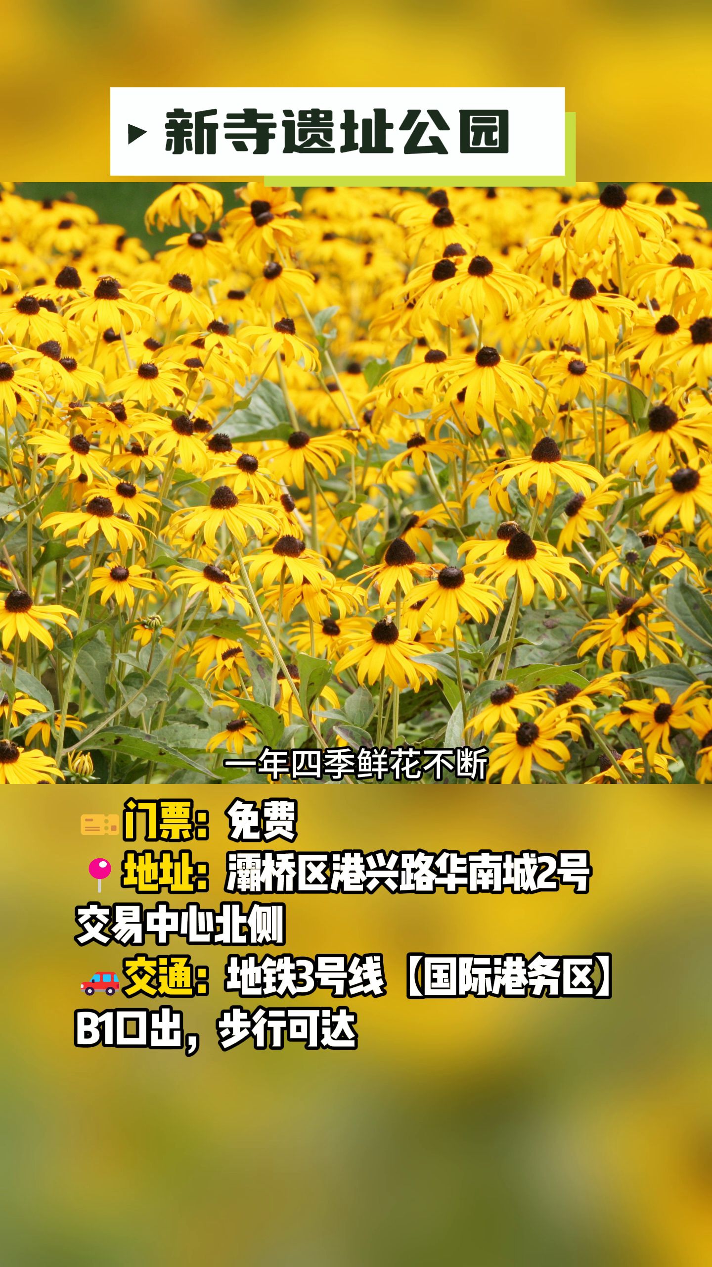 4. 新寺遗址公园:门票免费,地址灞桥区港兴路华南城 2 号,交易中心北侧,交通地铁 3 号线国际港务区,B1口 出,步行可达。曾是西汉时期的长门宫,是西汉馆陶长公主刘嫖所有的私家园林,后成为皇帝祭祀时的休憩之所。如今这里被打造成以花卉为主题的植物观赏园,一年四季鲜花不断。