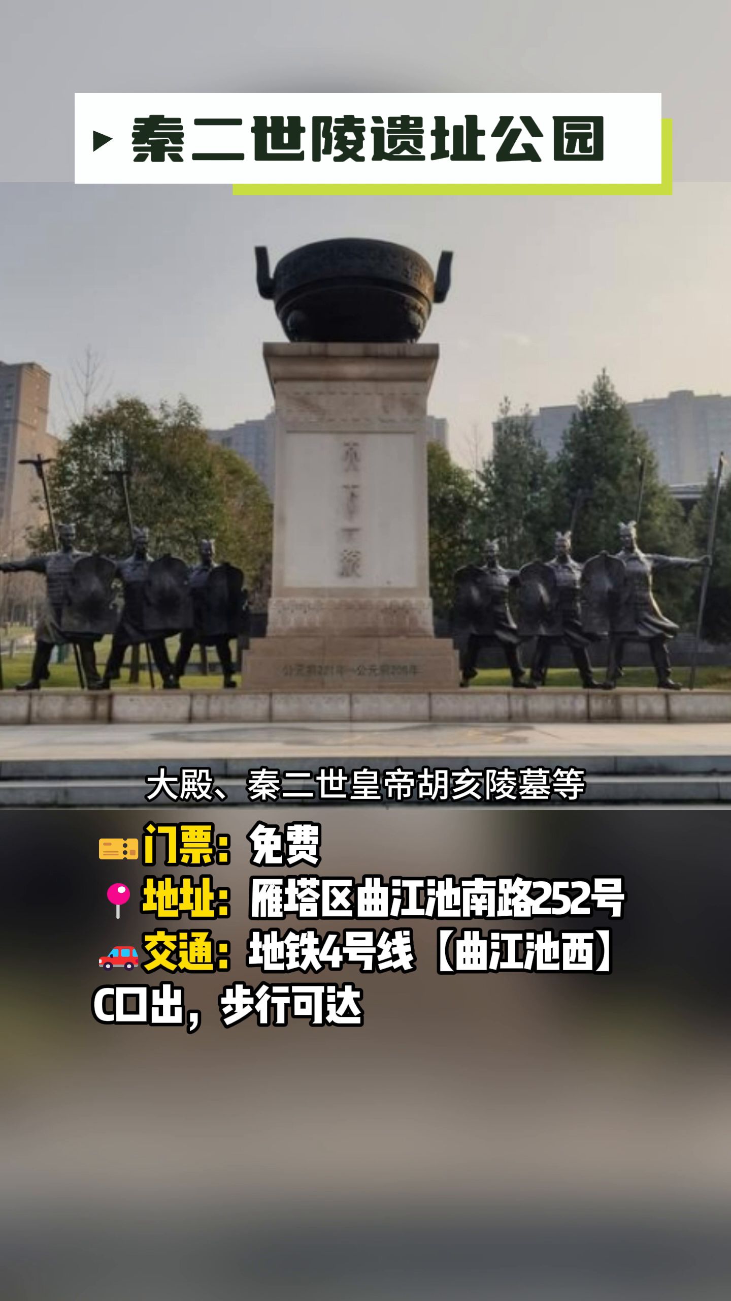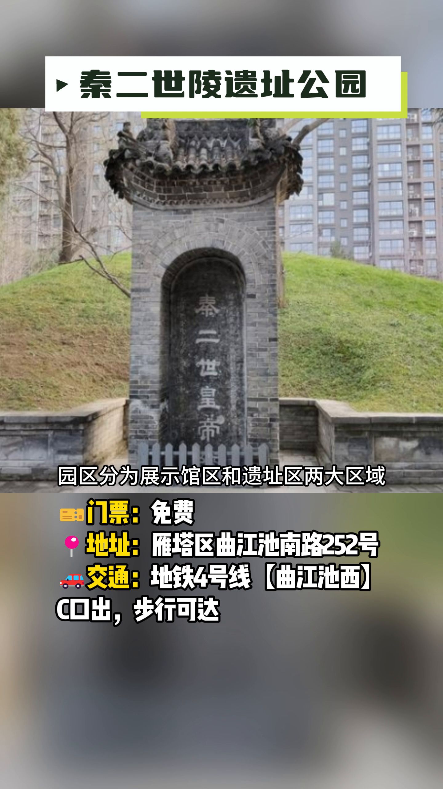3. 秦二世陵遗址公园:门票免费,地址雁塔区曲江池南路 252 号,交通地铁 4 号线曲江池西,C口出,步行可达。坐落于曲江池遗址公园南岸,这里是秦二世胡亥陵墓的所在地。园区分为展示馆区和遗址区两大区域,遗址区则包括原有遗存建筑山门、大殿、秦二世皇帝胡亥陵墓等。