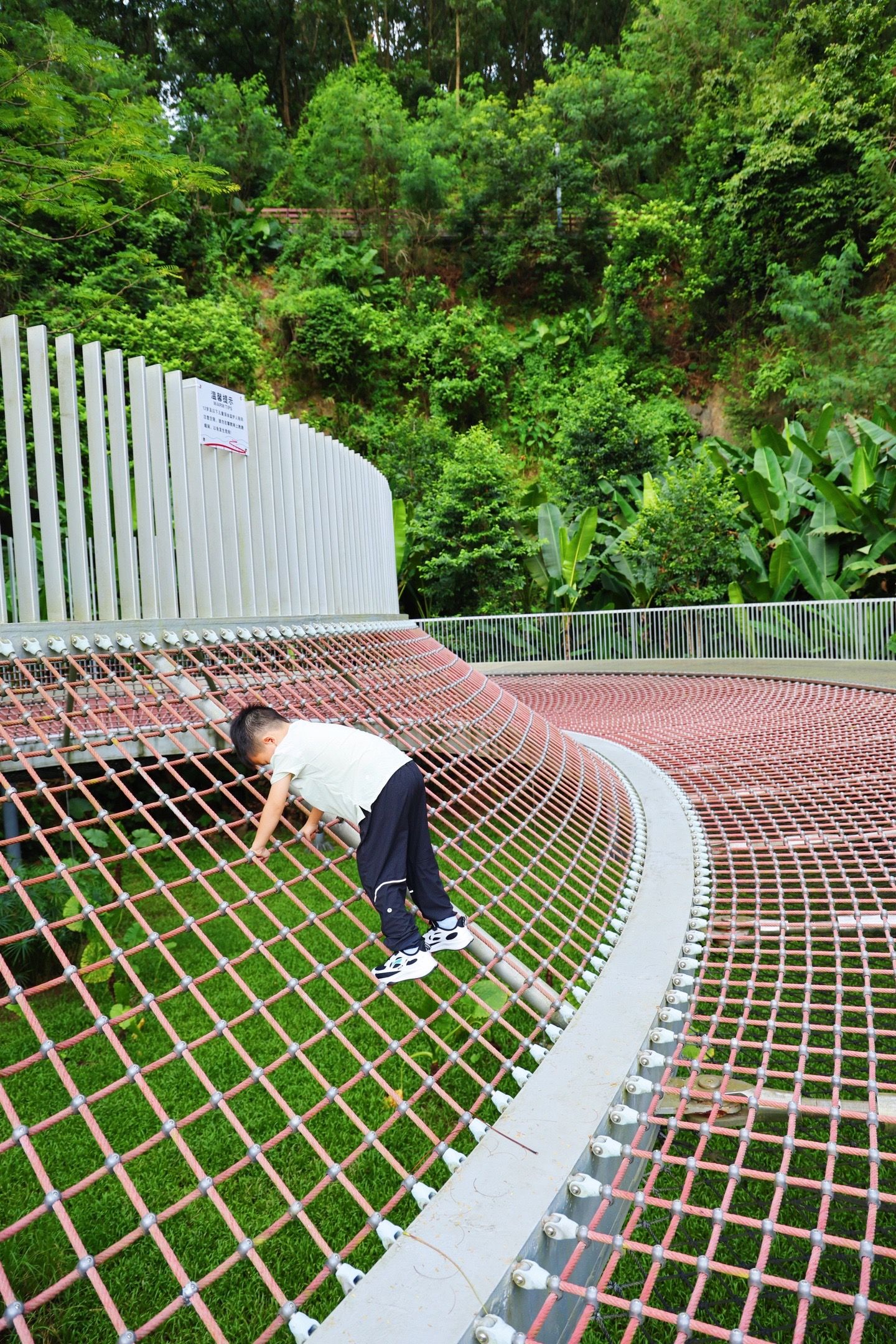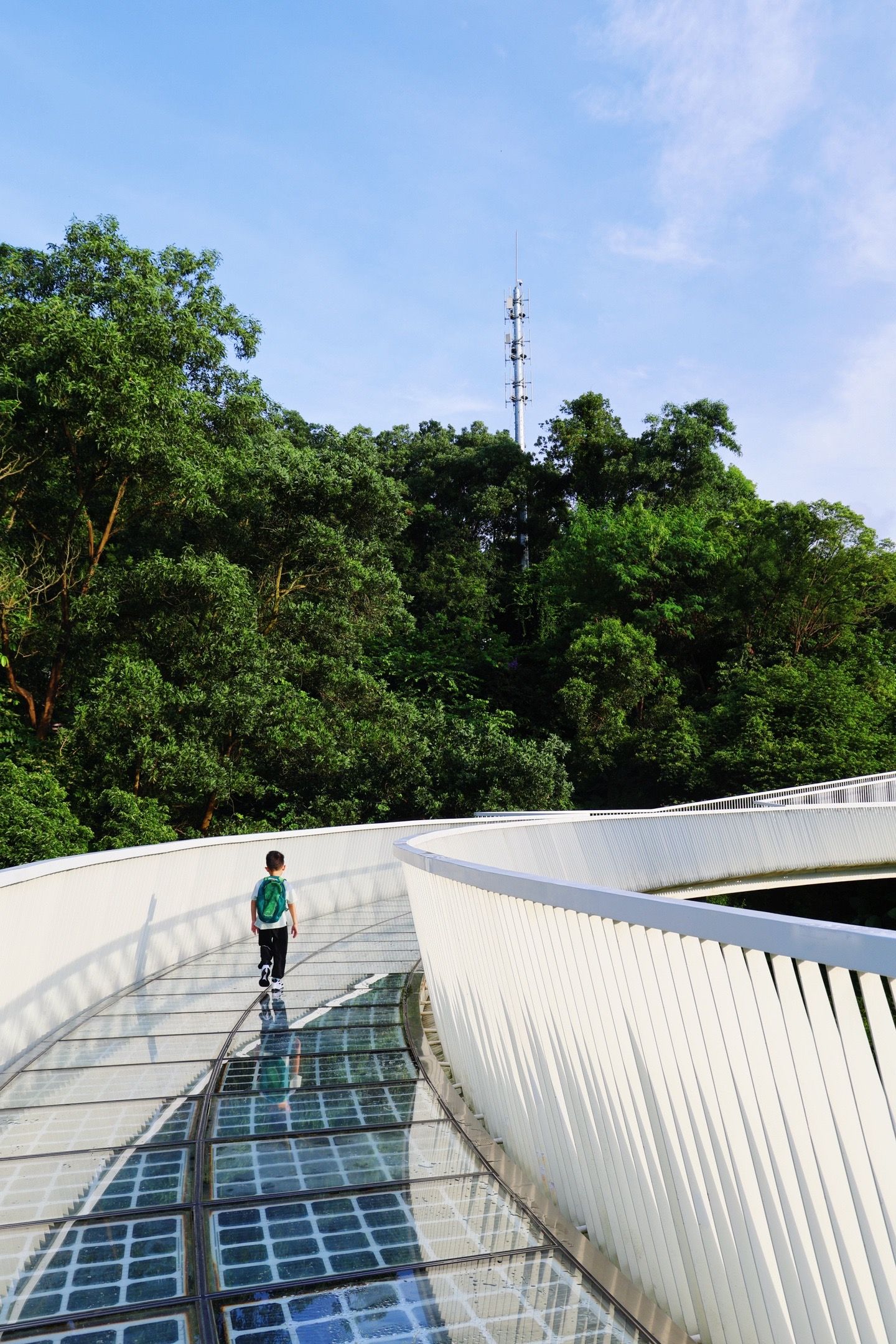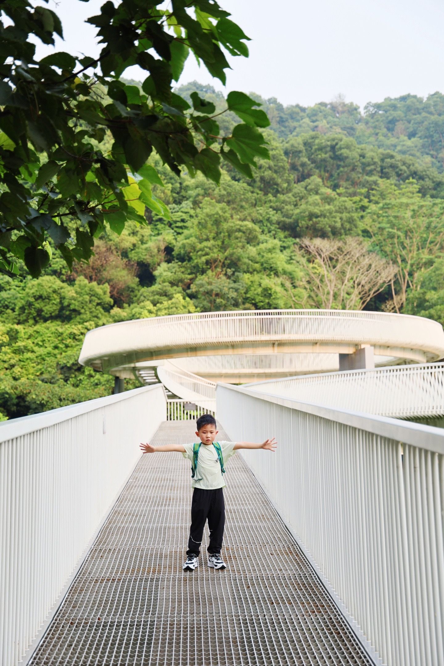 这里是光明的大顶岭绿道,全场6.4km,主路基本平坦的路面,不伤膝盖,对亲子比较友好,一路上会经过三座桥,依次是浮桥、探桥和悬桥