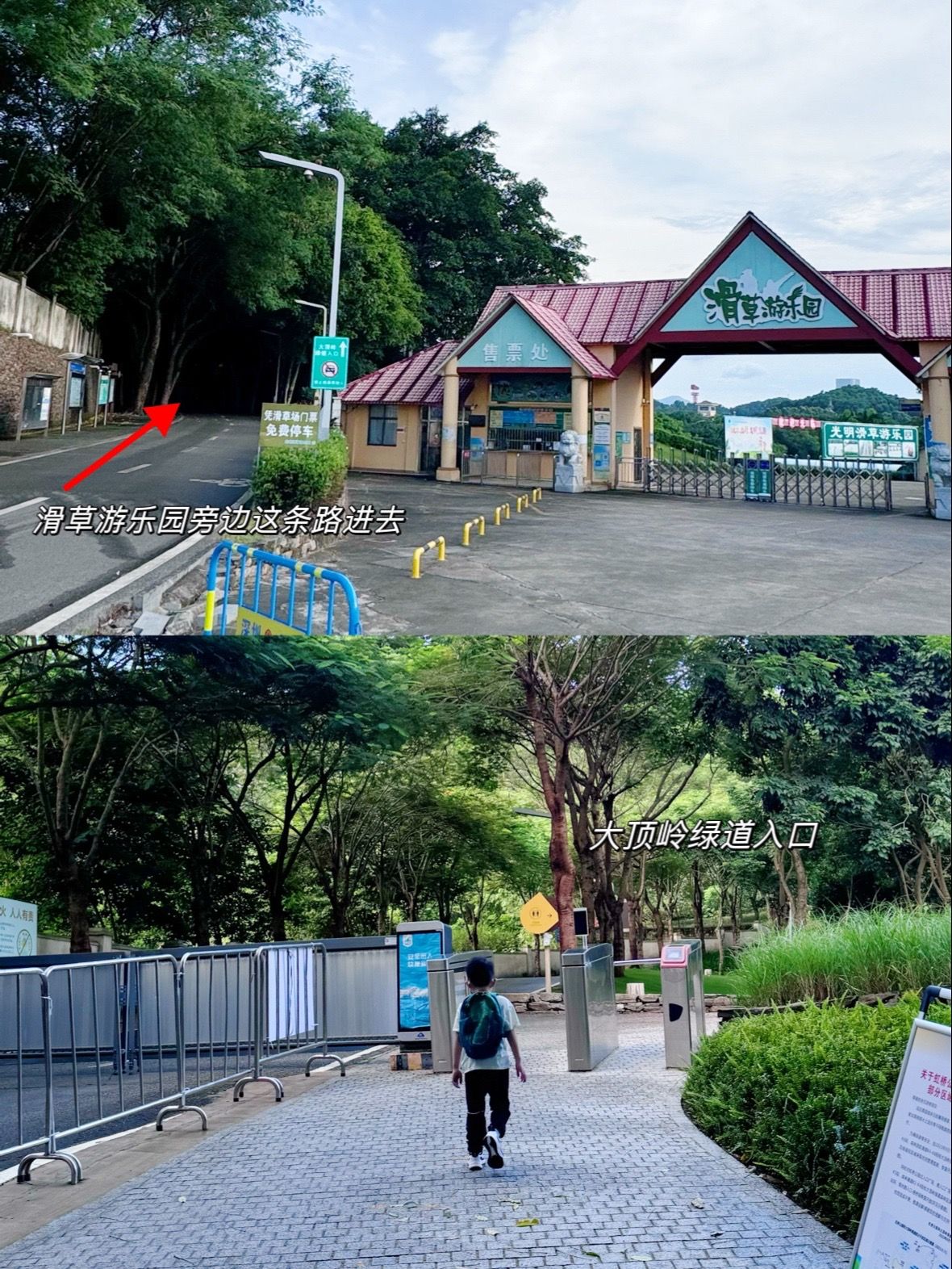 导航光明“滑草游乐园”,绿道入口就在旁边的小路进去(可以参考图18的)如果你是冲着高空玻璃桥去的,走这个入口去比较近,从入口步行到浮桥大约10分钟左右。乘坐公交到“光明滑草场”站下,自驾也可以停这里