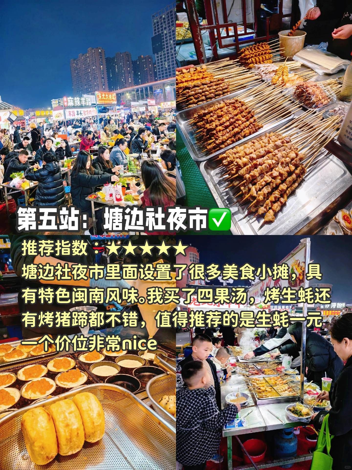 塘边社夜市里面设置了很多美食小摊,具有特色闽南风味。我买了四果汤,烤生蚝还有烤猪蹄都不错,值得推荐的是生蚝一元一个价位非常nice摊位上的阿姨还夸我们一行人长得好看哈哈哈哈四果汤要的是加椰奶的,里面料超级足喔~