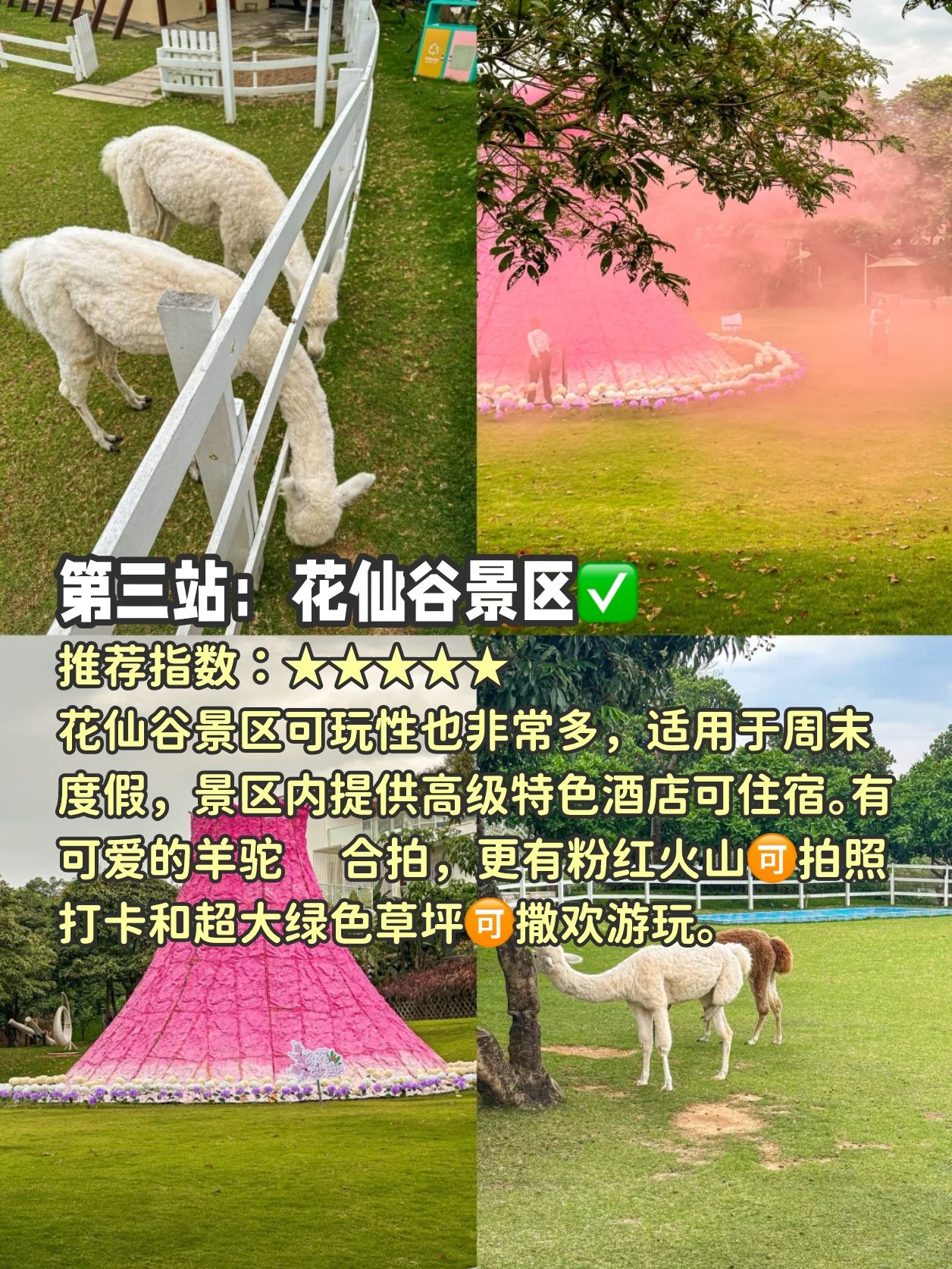花仙谷景区可玩性也非常多,适用于周末度假,景区内提供高级特色酒店可住宿。有可爱的羊驼合拍,更有粉红火山拍照打卡和超大绿色草坪撒欢游玩。