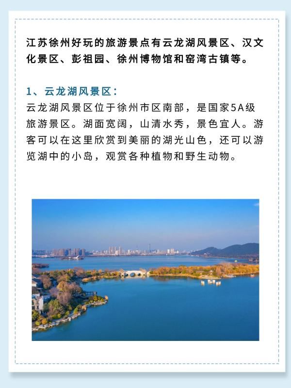云龙湖风景区:云龙湖是徐州市区内的一个大型人工湖,风景优美,环境宜人。湖边有云龙山,山上寺庙众多,如云龙山寺、观音洞等,是游客休闲、游玩的好去处。