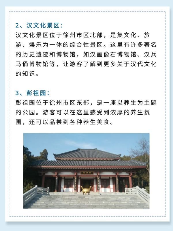徐州博物馆:徐州博物馆是中国首批国家一级博物馆之一,馆藏丰富,尤以汉文化遗物最为著名。在这里,游客可以了解到徐州悠久的历史和灿烂的文化。