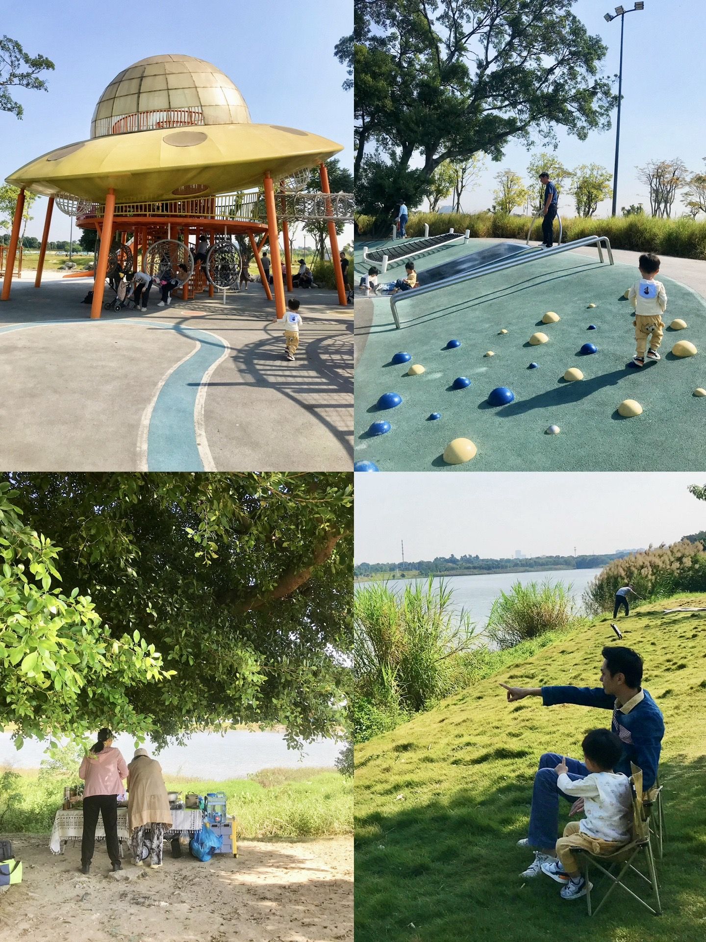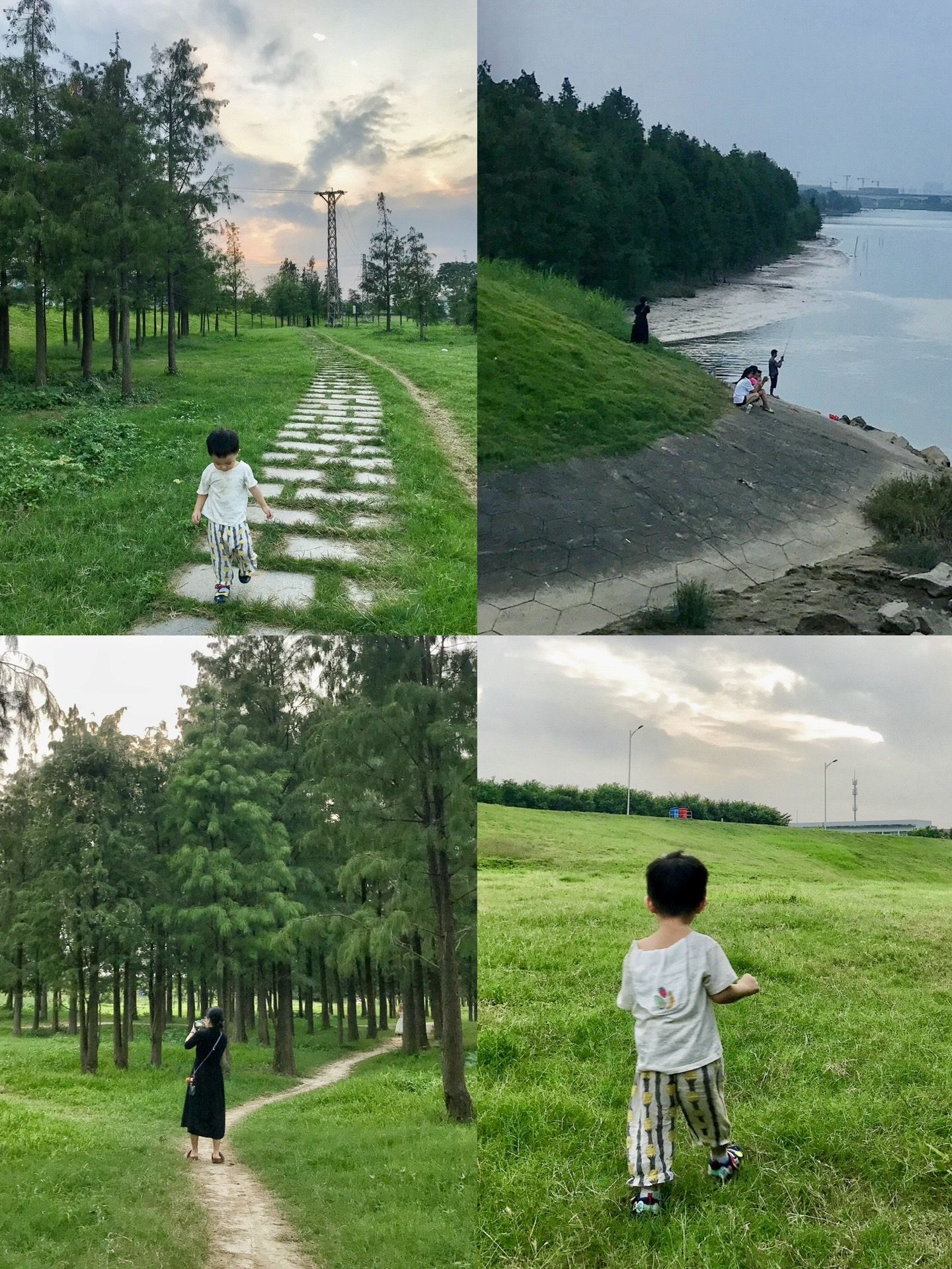 一个江边公园,有儿童儿童游玩设施,可以挖沙、玩水区...河道两边可以露营天幕、搭帐篷