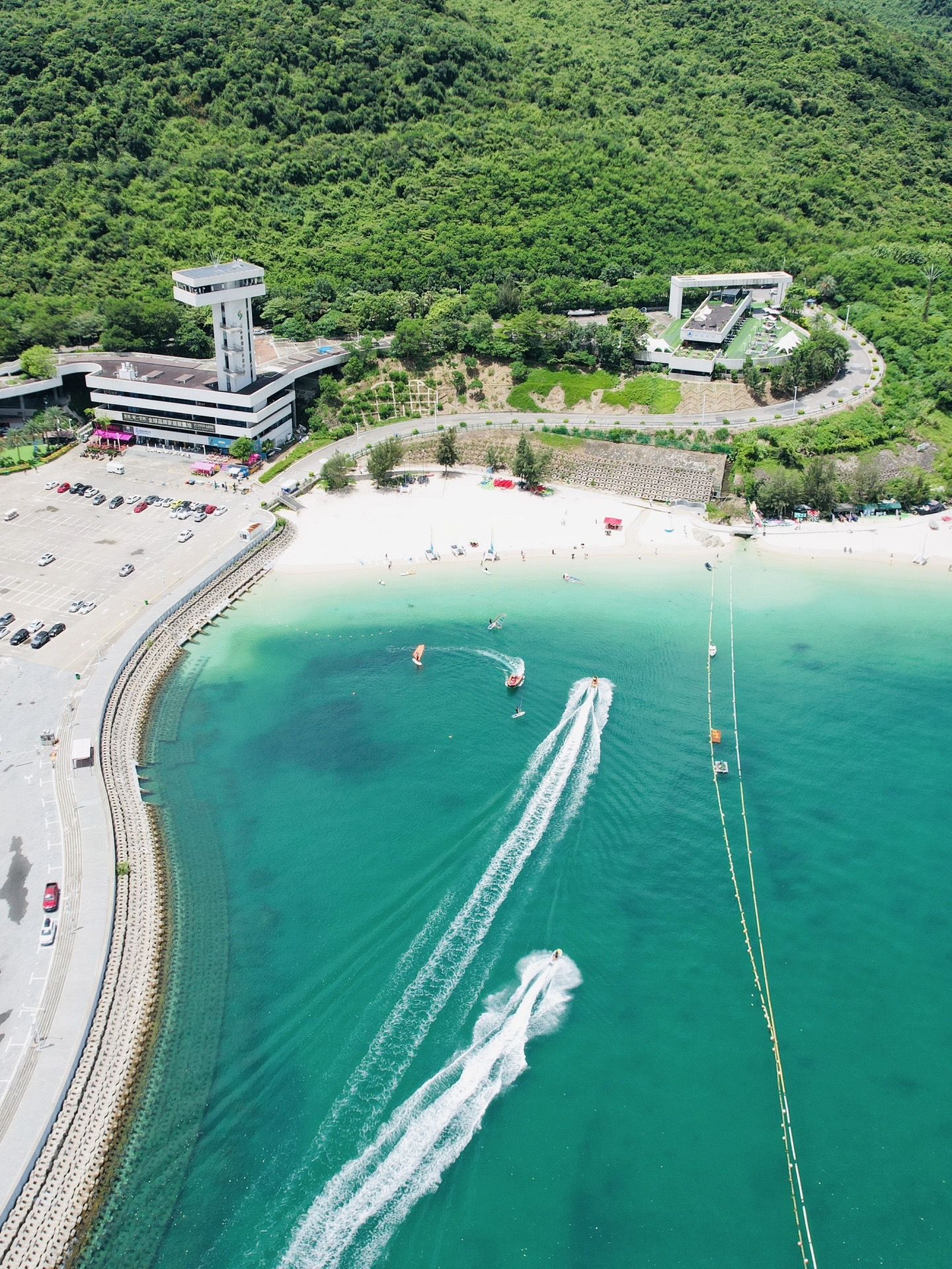 中间区域有防鲨网,可下海游泳,还可搭天幕野餐、可坐船出海、有海上项目摩托艇可游玩