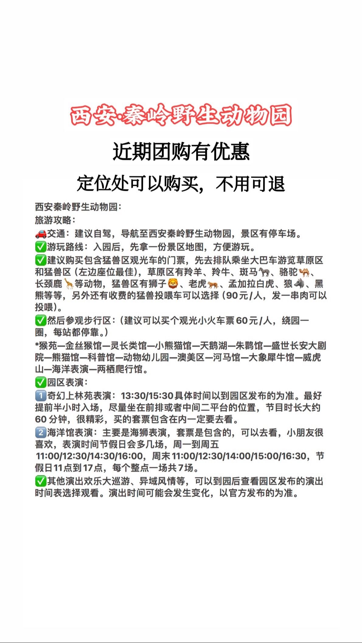 交通:建议自驾,导航至西安秦岭野生动物园,景区有停车场。