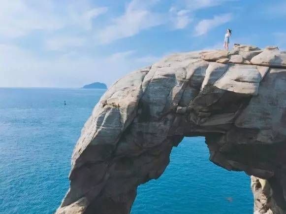 海蚀洞上弯曲的岩石神似大鼻的长鼻深向海中,故被称为象鼻岩。