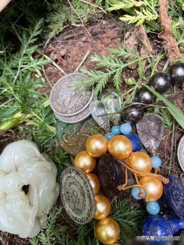 还有元宝状的物件,中间镶嵌着闪烁红光的珠子,宛如一颗颗红宝石;更有一些金色物件,形状似花生,却散发着一种异样的光辉,让人不禁猜测它们背后的故事。