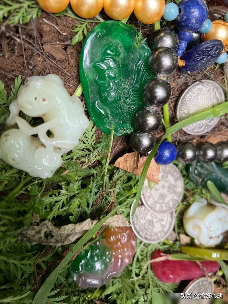 木罐子里装满了各种古物件,每一件都闪烁着夺目的光芒。那些物件有的翠绿色和深绿色,仿佛是用碧玉雕琢而成的吊坠;有的乳白色,如同洁白无瑕的和田玉手把件。