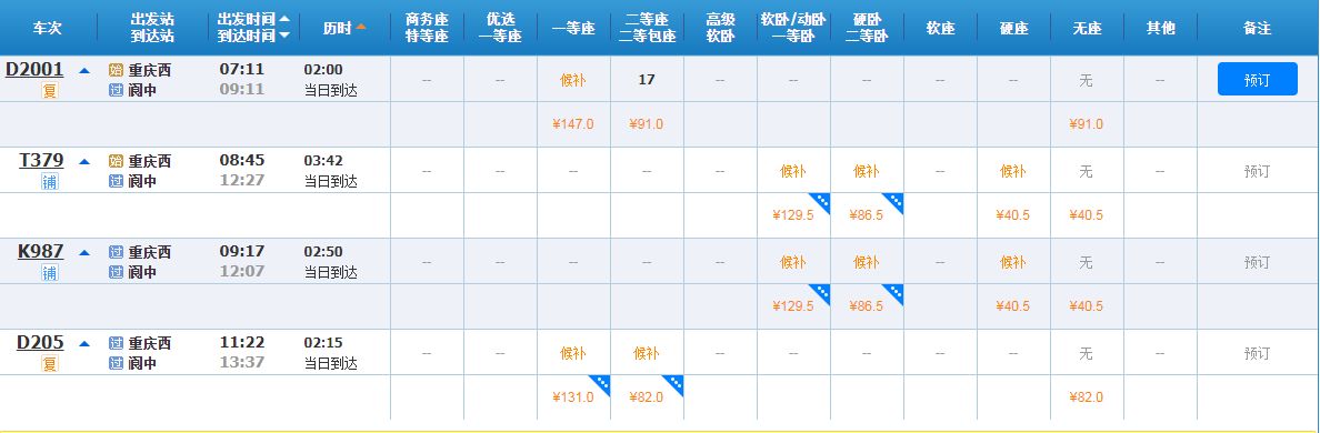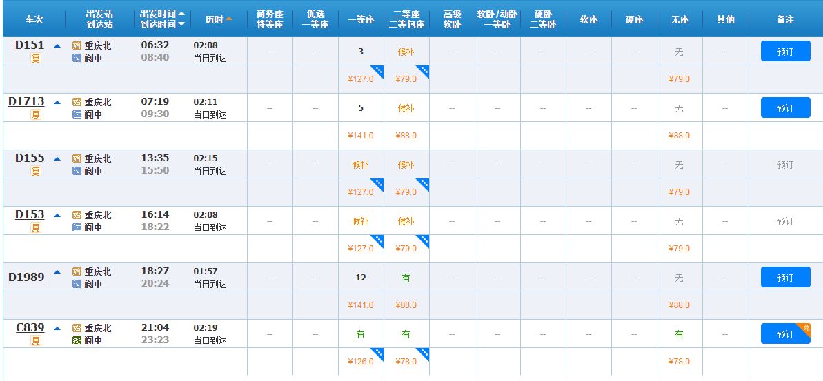 重庆北-阆中,动车出发时间从06:32~21:04期间都有,车程普遍2个小时10分钟左右,票价79~141区间;