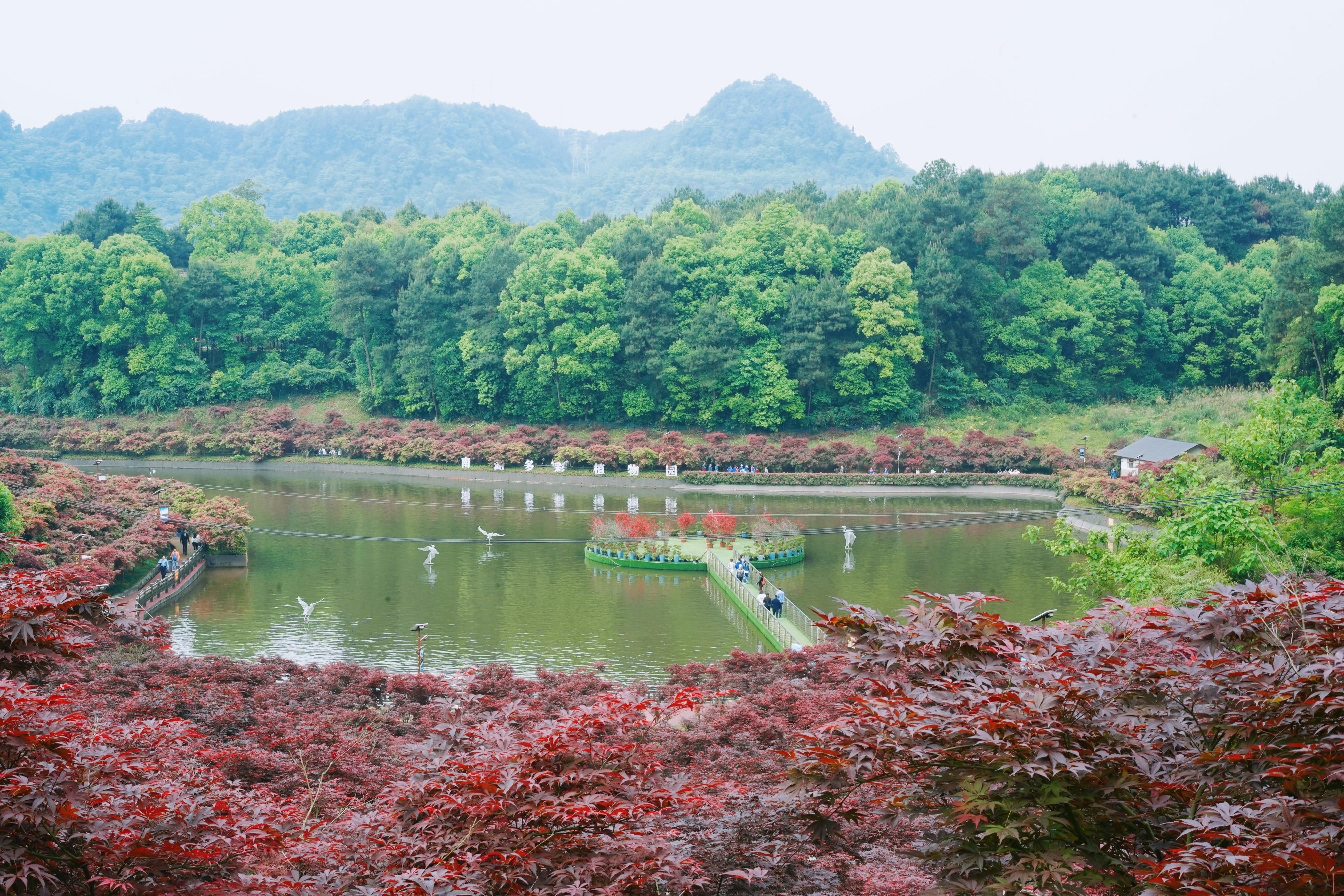 植物园的红枫总共有2万多株,他们的品种分别是日本红枫和中国红枫,其中日本红枫的观赏期是3-5月和10-11月,五一节正好遇到它变红的第一期,因此春天看到红枫,成了重庆巴南的一道独特而浪漫的风景线。