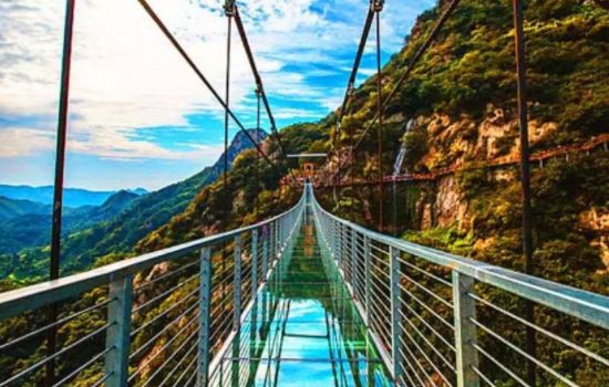 值得一提的是龙潭沟的网红探险桥!该桥全长117米,离地将近50米,悬空钢索设计,仅在桥面间隔放置特种玻璃以及木头。游客需身系安全绳,踩着玻璃或者木头才能通行。刺激性、互动性、体验性极强。