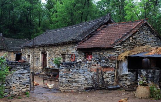 整个村落靠山背水,村落鳞次栉比的夯土房屋,在郁郁葱葱的山麓下,呈现出了浓郁的豫南建筑风格。