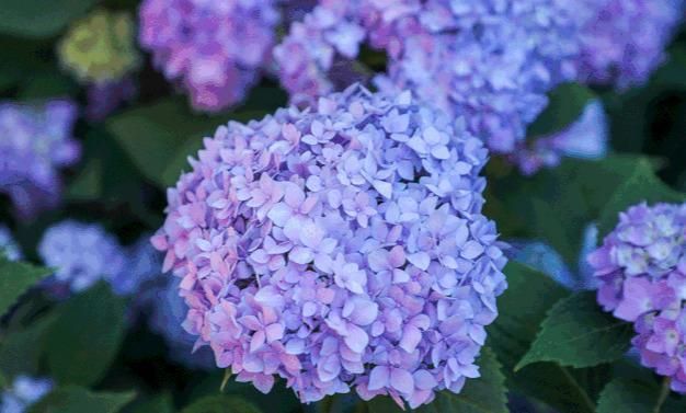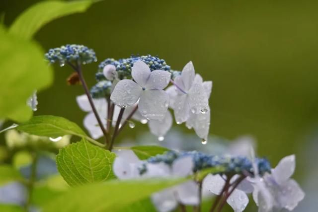 雨天里的绣球花,绿叶与多彩的花瓣相称,雨滴落在花瓣上摇摇欲坠,是像雕塑般的美景。