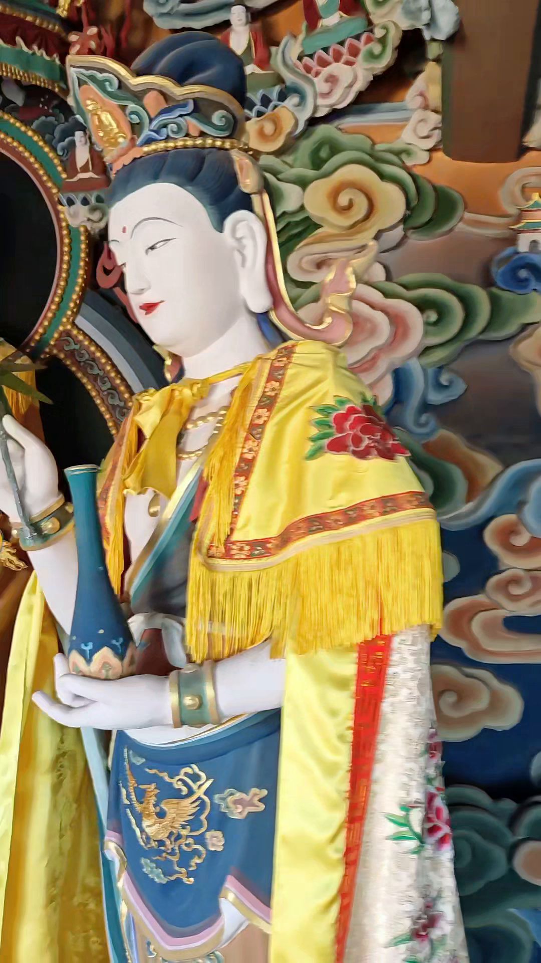 这也不知道是什么店,外面是哼哈二将上面琉璃顶,这音乐放的也太乱了,乱七八糟的熙熙攘攘折腾。宝里的一个四大天王,但是他这个做的很威武,很威武,后头是一个尾托,这尾托是云朵之上在房梁上有点意思,还是应该是尾托或者宝典。四大天王很威武,这边是弥勒佛,作品很精致。