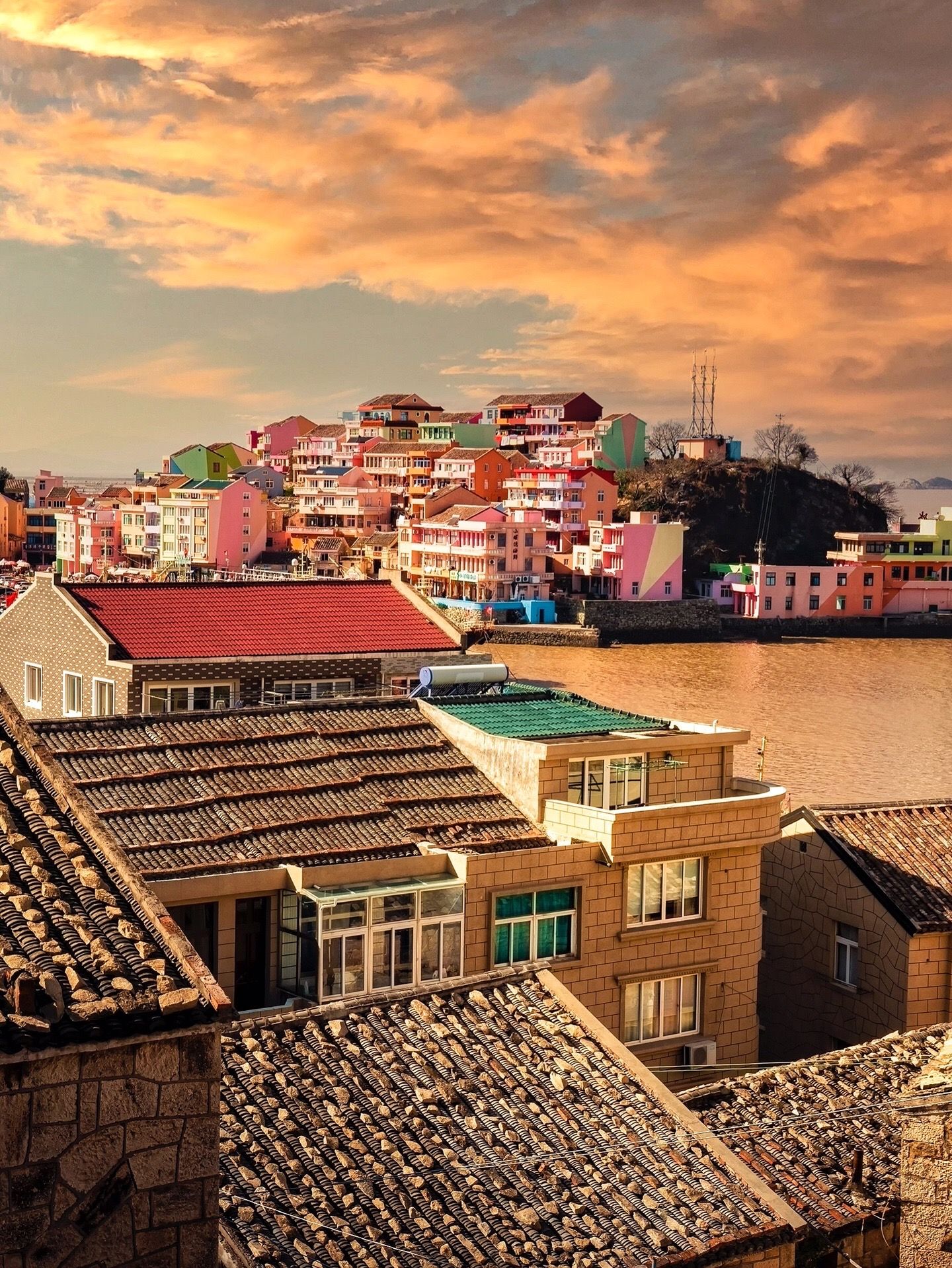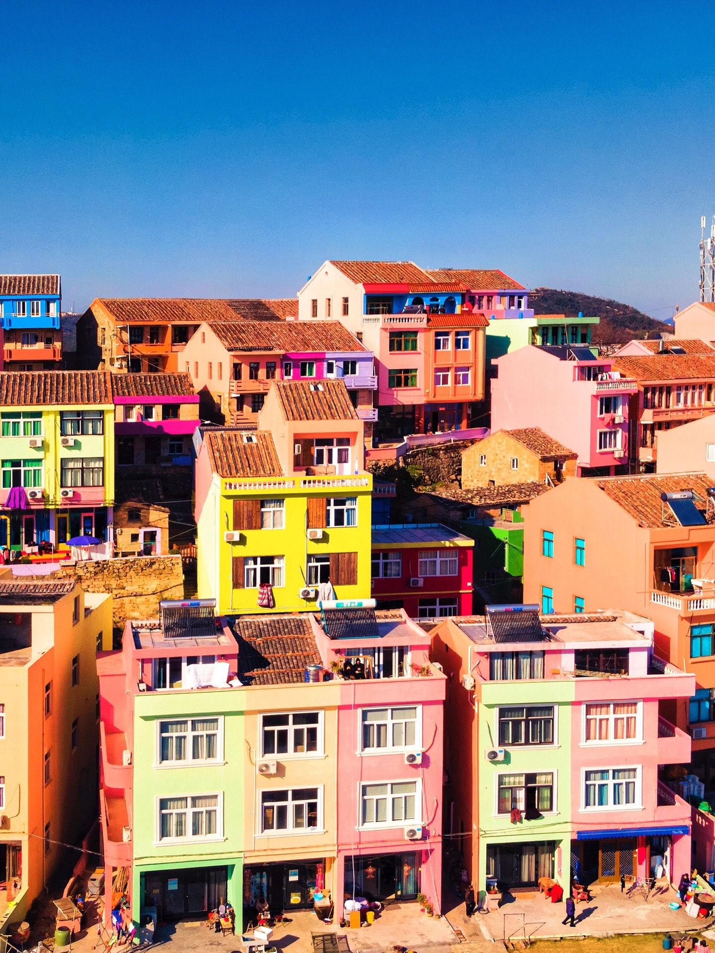 马卡龙色的房子在海边交错排列,像一个色彩缤纷的童话世界,晴天拍照非常出片