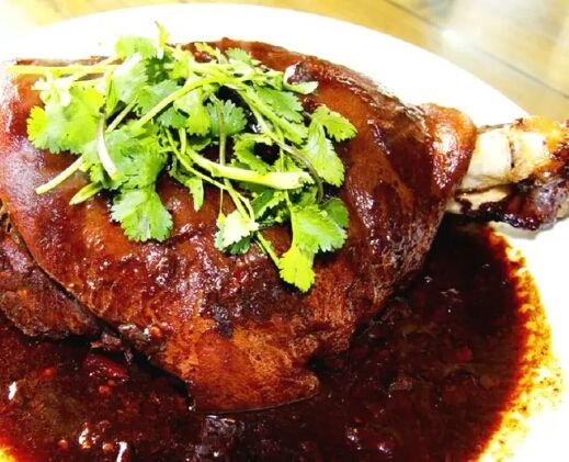 带把肘子作为一道经典名菜,菜形别致,配料多样,制作讲究,工艺复杂。以香味突出,色、香、味、形俱佳著称。色泽枣红,如把柄,故称"带把肘子"。它的用料别致,不同于其它肘菜。肘子带骨带蹄,成菜如丘,造型别致、丰满,堪称"盘中一王。历经改进带后的带把肘子久盛不衰,香醇酥烂,肥面不腻,肘皮胶粘,妙不可言。