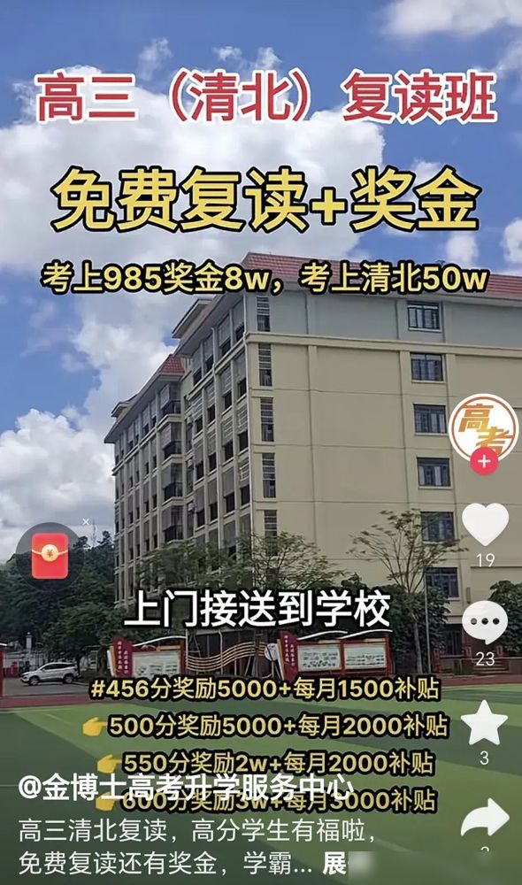 广西钦州的一家培训机构为吸引更多学子复读,一次性放出高达数十万元的彩头。