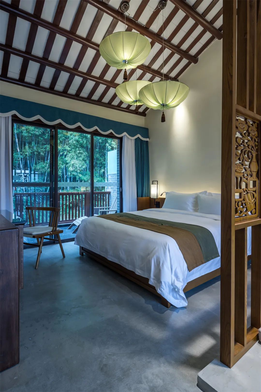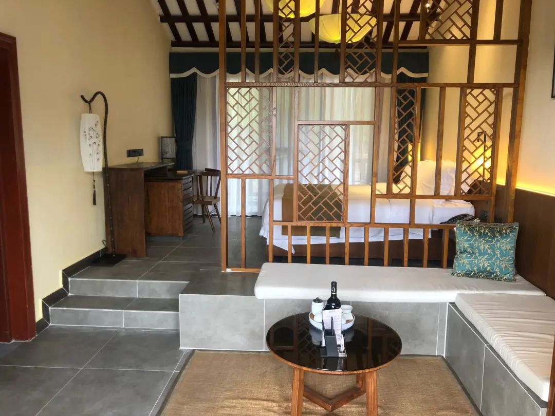 房型有望乡阁景观房,流溪阁景观房,套房,亲子套房,家庭套房,两房一厅,房型多样化能满足不同需求。预定的是望乡阁双床,床铺干净整洁,房间很大,有80平,阳台有个泡池,无限次水,可以望到林间小道,有竹林野花!房间配备了咖啡机,下午茶也可以送到房间享用。