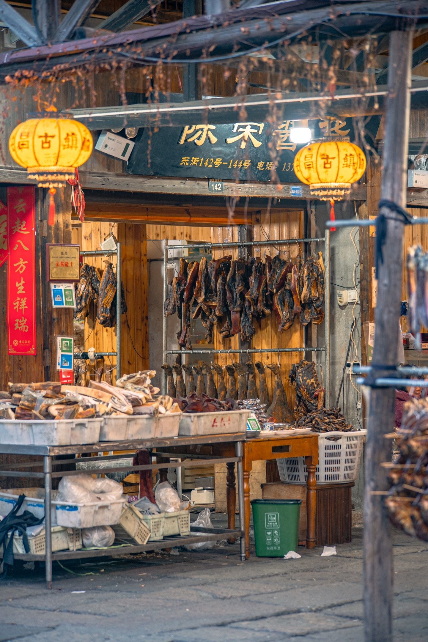 随处可见的腊肠、熏肉、酱鸭、鹌鹑是安昌古镇独有的特色