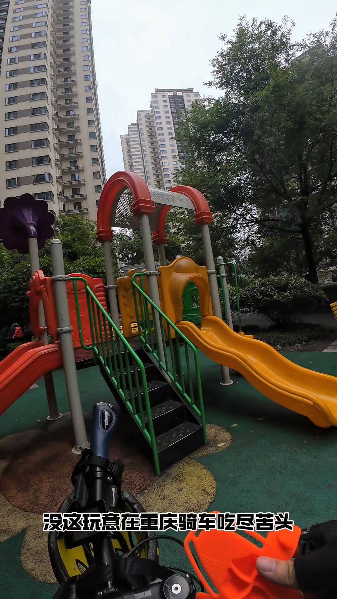 坡太陡了骑不动了,进入推车状态,而且地面潮湿骑,有些看不见的青苔导致轮胎没抓地力,太危险了还是推上去吧,累瘫了。在山上观看整个重庆主城区,值得打卡打卡。推到上去还以为是观景台景点之类的,没想到是一个小镇,一脸懵逼。