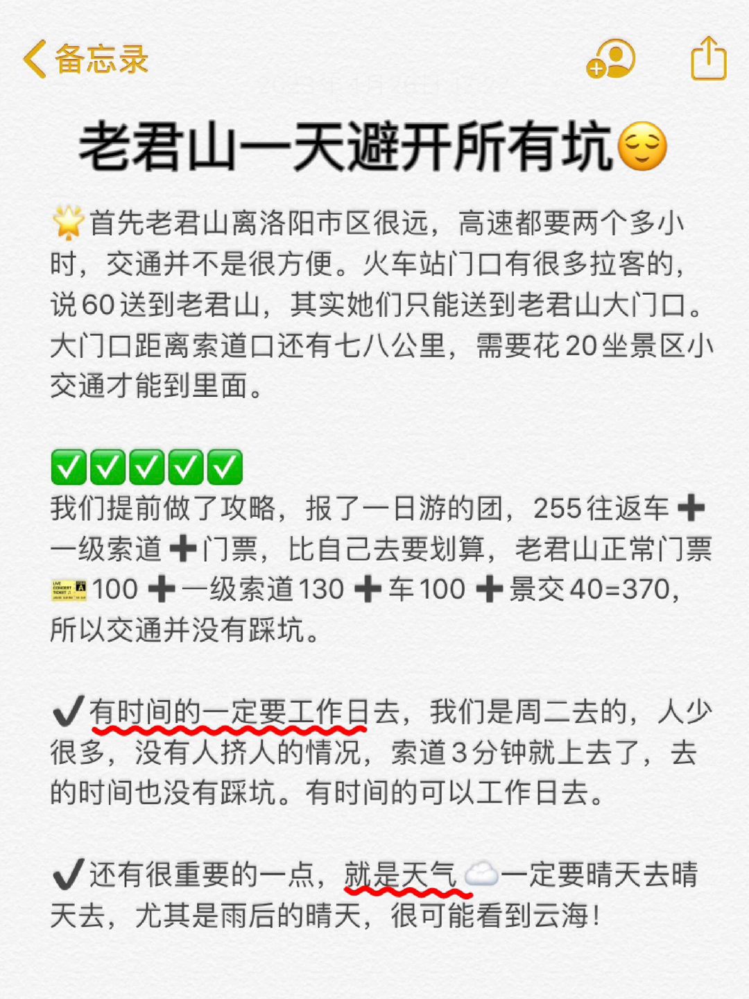 一级索道+门票,比自己去要划算。老君山正常门票100+一级索道130+车100+景交40=370,有时间的一定要工作日去,我们是周二去的,人少很多,没有人挤人的情况,索道3分钟就上去了,去的时间也没有踩坑。有时间的可以工作日去。就是天气一定要晴天去晴天去,尤其是雨后的晴天,很可能看到云海!
