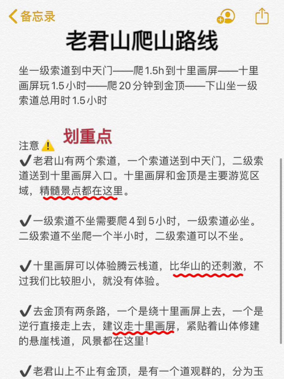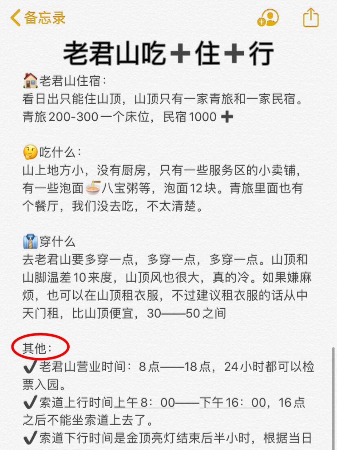 老君山有两个索道,一个索道送到中天门,二级索道送到十里画屏入口。十里画屏和金顶是主要游览区域,精髓景点都在这里。去老君山要多穿一点,多穿一点,多穿一点。山顶和二级索道不坐爬一个半小时,二级索道可以不坐。十里画屏可以体验腾云栈道,比华山的还刺激,不过我们比较胆小,就没有体验。去金顶有两条路,一个是绕十里画屏上去,一个是逆行直接走上去。建议走十里画屏,紧贴着山体修建的悬崖栈道,风景都在这里!老君山上不止有金顶,是有一个道观群的,分为玉看日出只能住山顶,山顶只有一家青旅和一家民宿。青旅200-300一个床位,民宿1000+山上地方小,没有厨房,只有一些服务区的小卖铺,个餐厅,我们没去吃,不太清楚。穿什么山脚温差10来度,山顶风也很大,真的冷。如果嫌麻烦,也可以在山顶租衣服,不过建议租衣服的话从中间天门租,比山顶便宜,30--50之间。