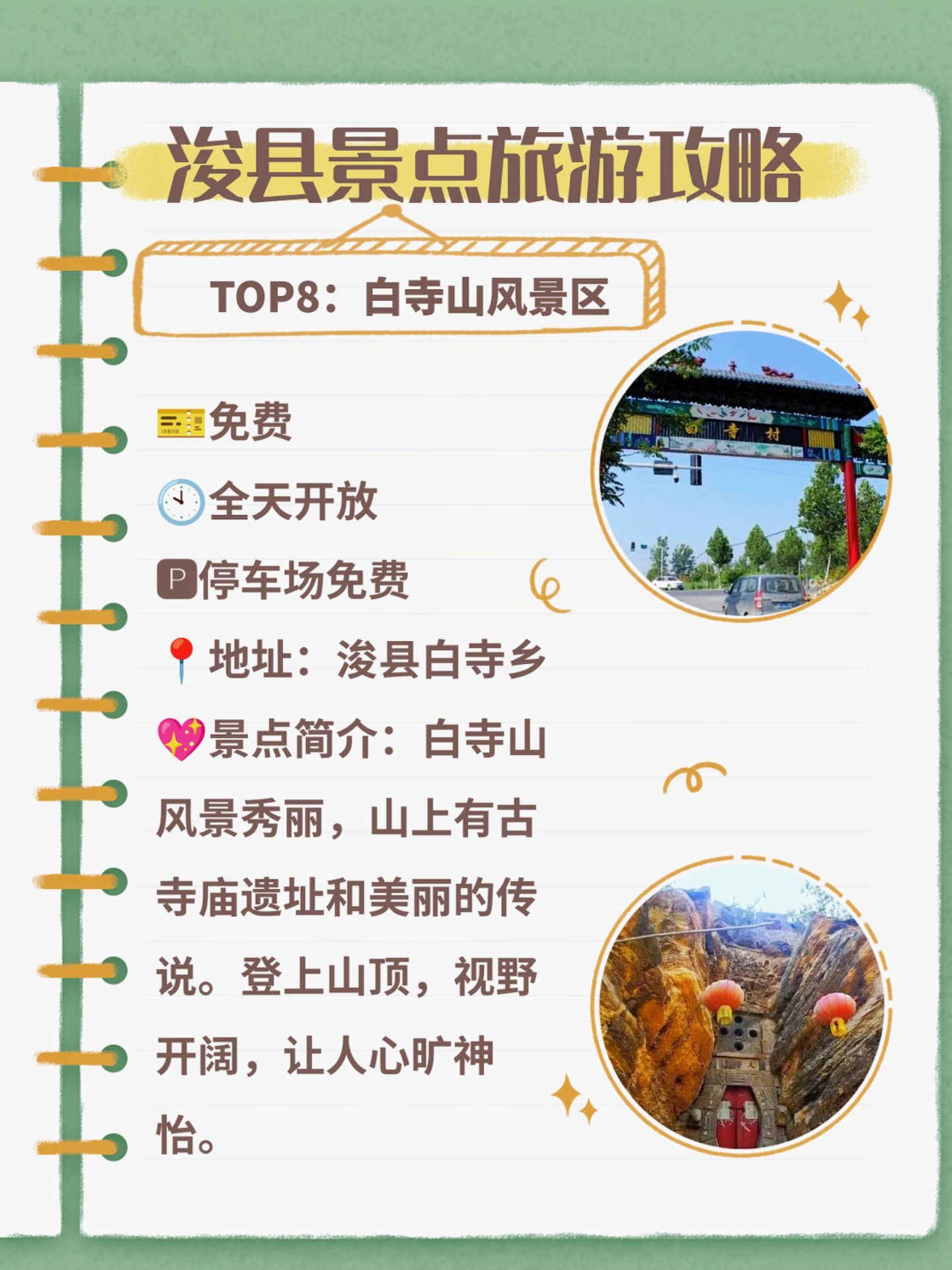 景点简介:白寺山风景秀丽,山上有古寺庙遗址和美丽的传说。登上山顶,视野开阔,让人心旷神怡