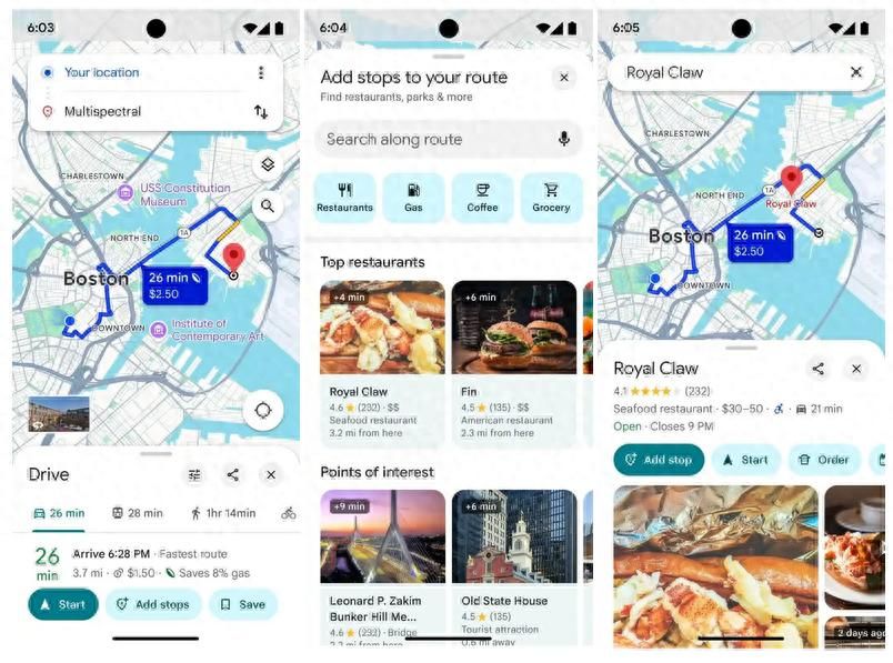 此外,用户可以在“沿途搜索”字段中找到餐厅、加油站、咖啡店和杂货店等标签,并可以查看距离和相关信息。