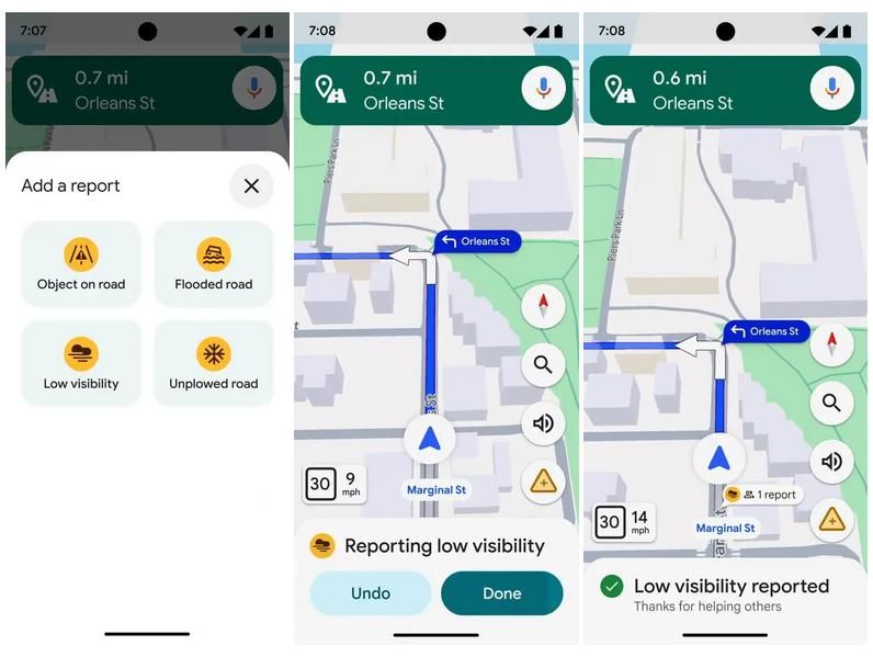 导航时,用户会看到车道标记中的蓝线,指示应该行驶的车道;用户还可以通过改进的用户界面报告天气干扰,例如未清理的道路和低能见度等情况。