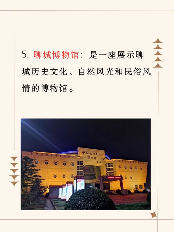 5. 聊城博物馆:聊城博物馆是一座展示聊城历史文化、自然风光和民俗风情的博物馆。游客可以在这里了解聊城的历史和文化。