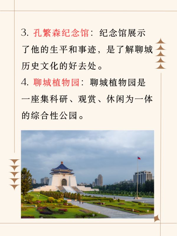 3. 孔繁森纪念馆:孔繁森是聊城的著名人物之一,他的纪念馆展示了他的生平和事迹,是了解聊城历史文化的好去处。