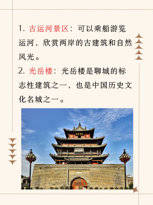 2. 光岳楼:光岳楼是聊城的标志性建筑之一,也是中国历史文化名城之一。游客可以登上光岳楼,俯瞰整个城市的美景。
