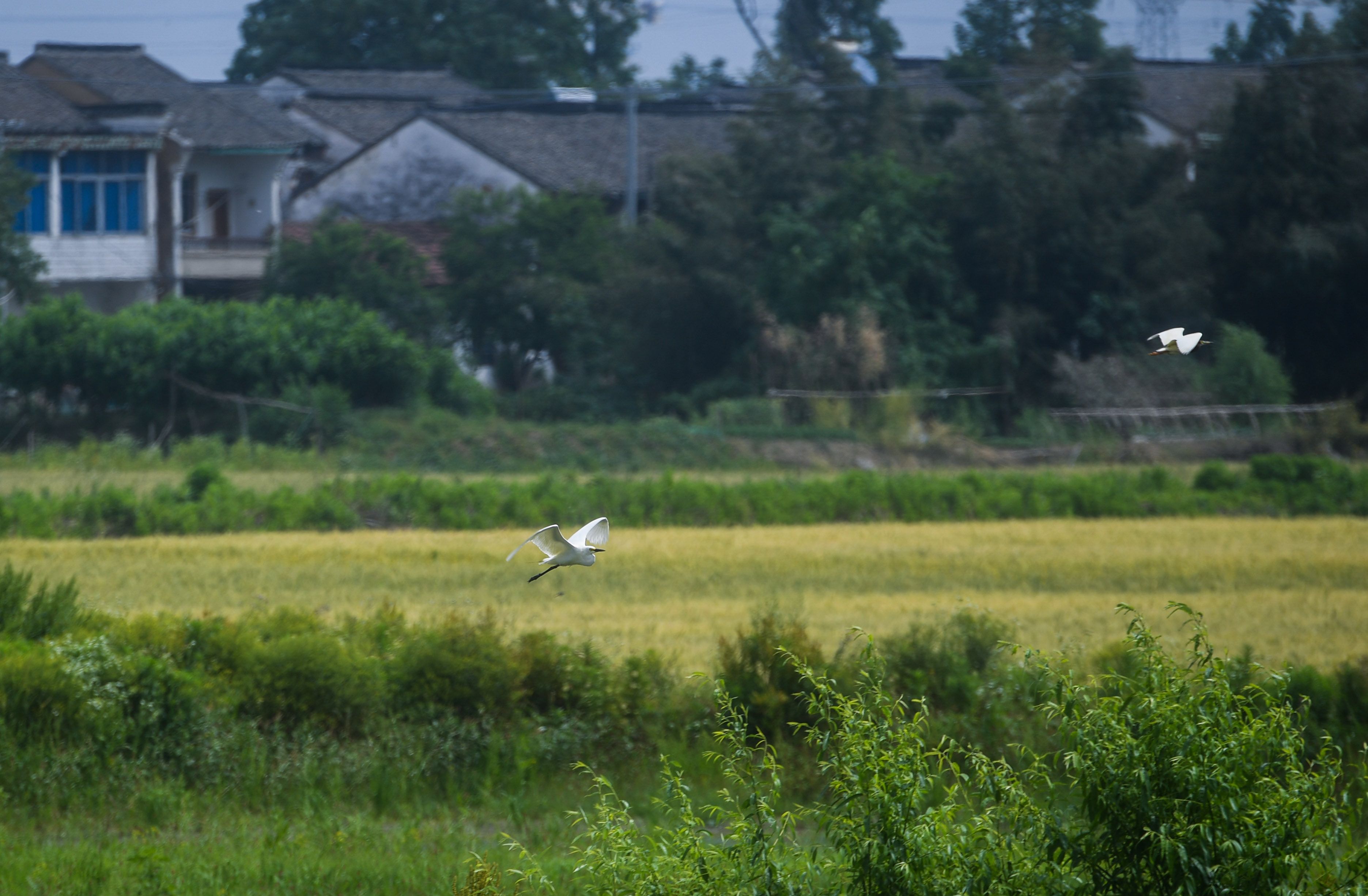 在东林镇东升村,白鹭飞过麦田(5月7日摄)。 新华社记者 徐昱 摄