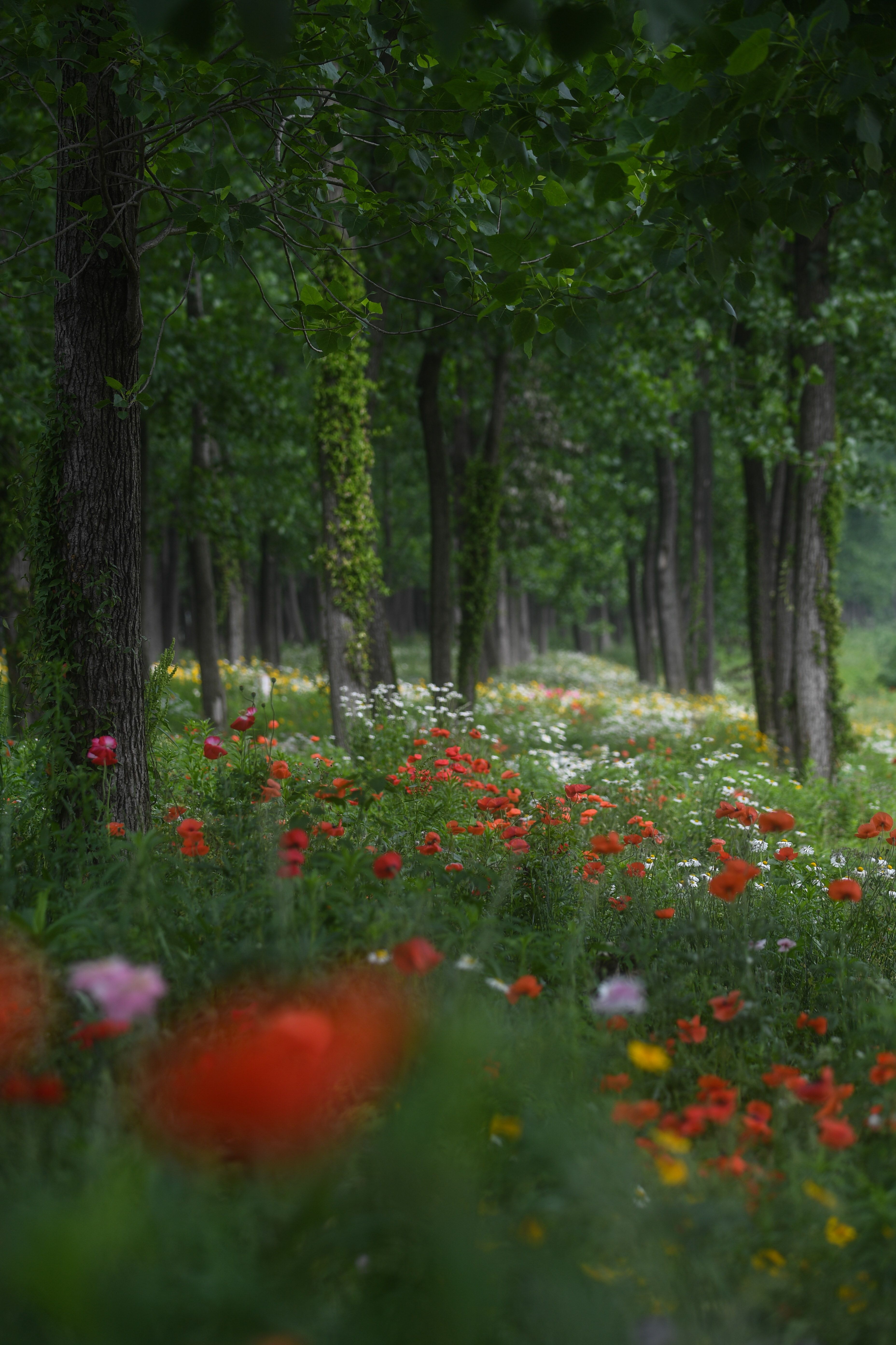 在东林镇东升村,田野边的树林中鲜花盛开(5月7日摄)。 新华社记者 徐昱 摄