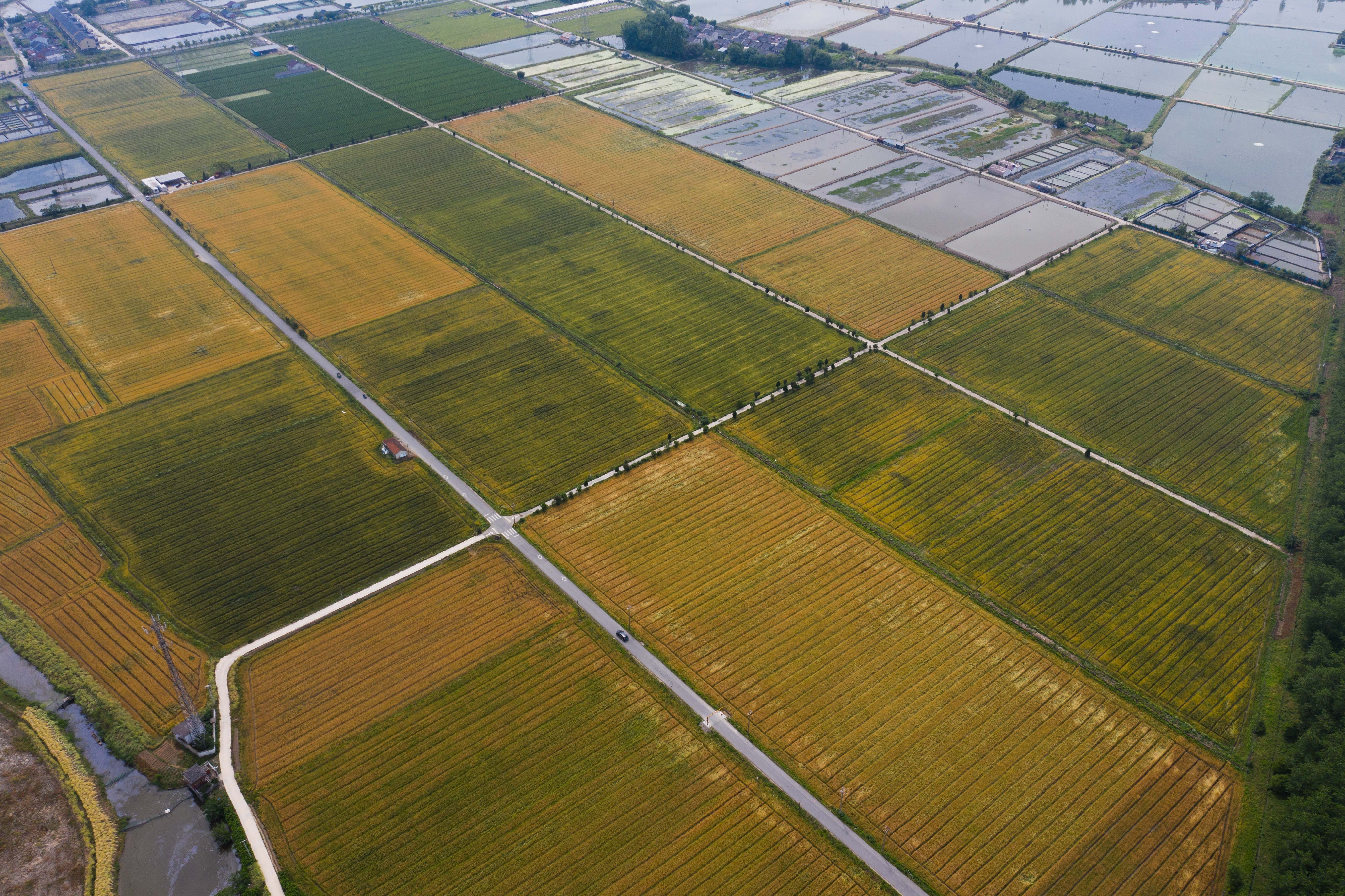 初夏时节,浙江省湖州市吴兴区东林镇万亩田野里的金黄的小麦、绿色的桑叶、彩色的花海还有白鹭等野生鸟类等构成了一幅五彩田园的美丽景色。