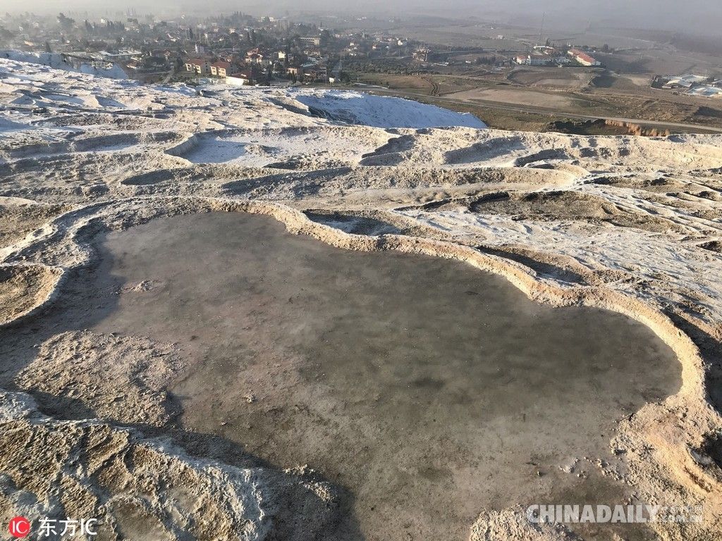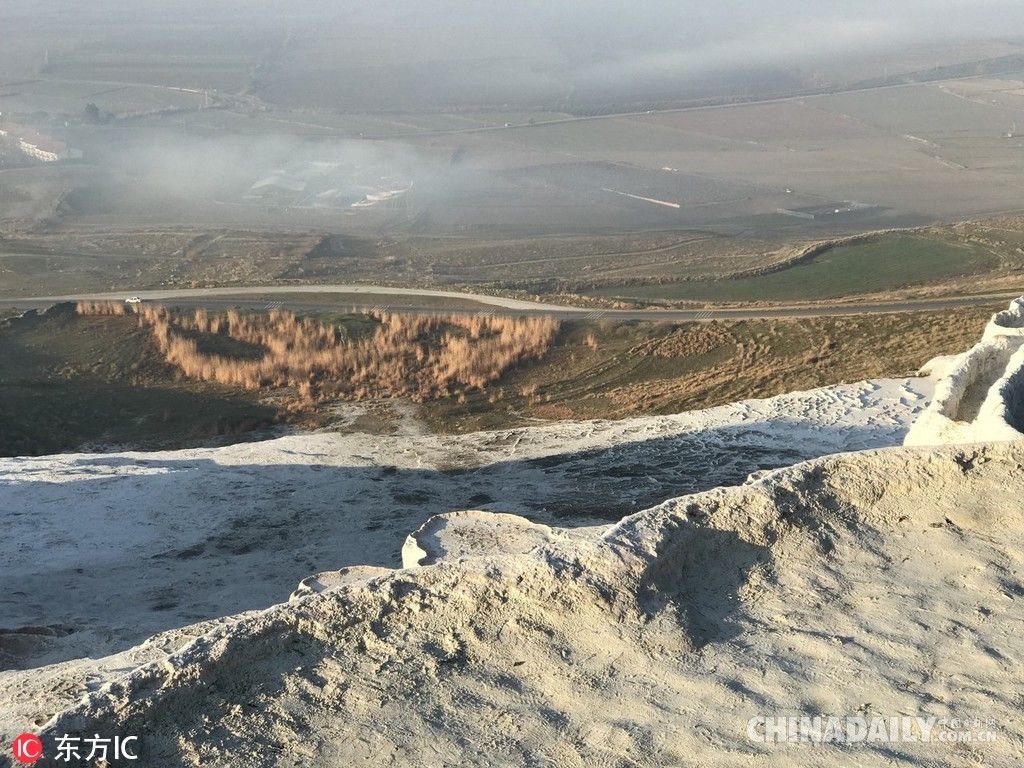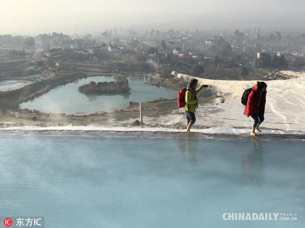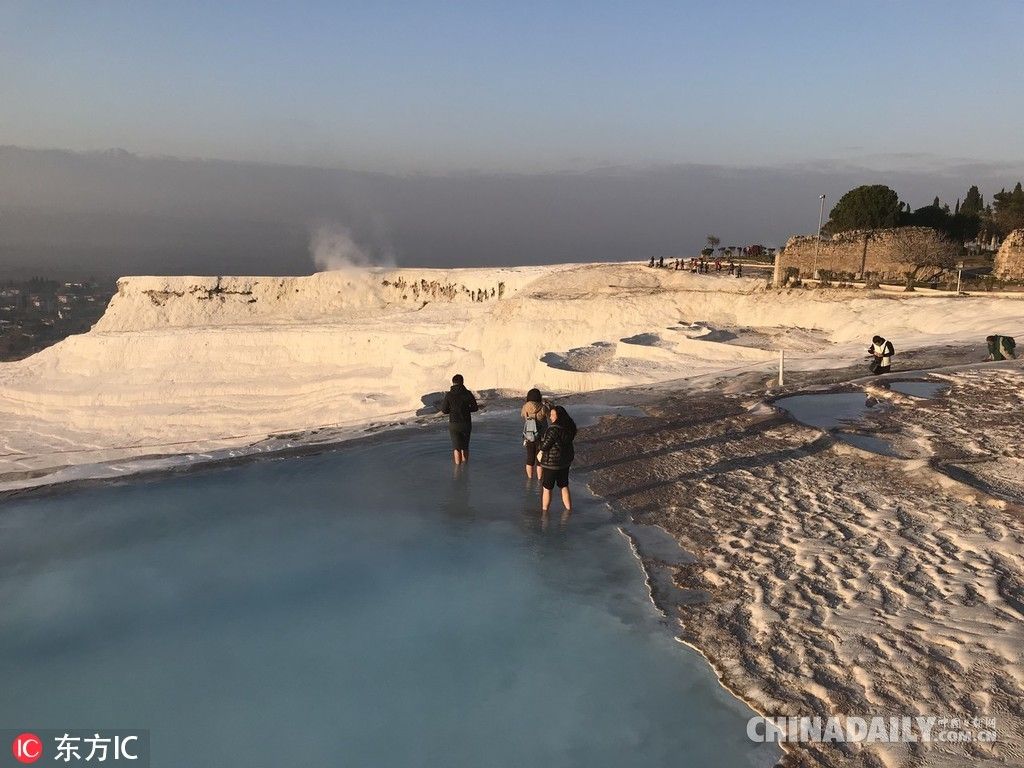 石灰华梯田是棉花堡的主景点,含有石灰石成分的泉水在高地结晶后,形成层叠的镜面梯田。出于保护原因,游客不能穿鞋进入景区。(图/东方IC)