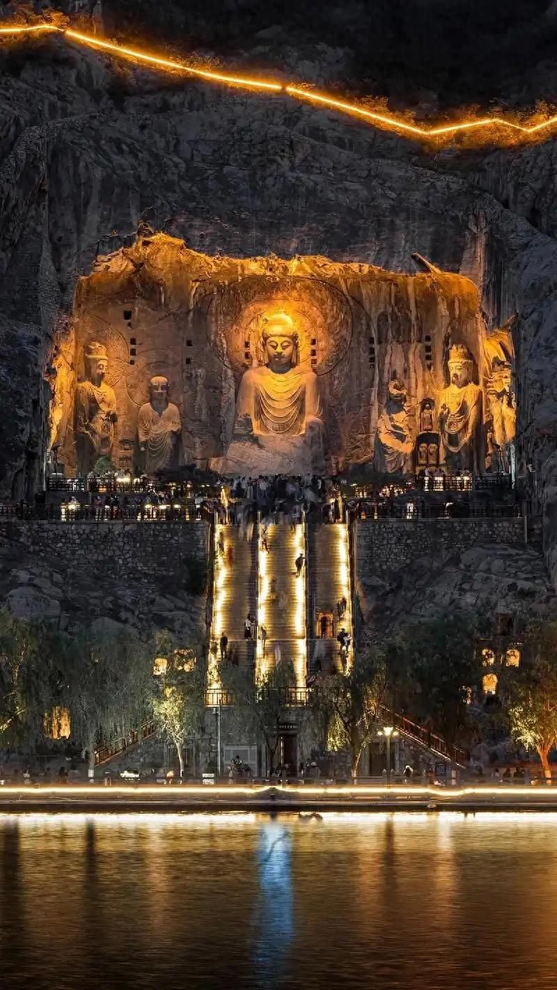 奉先寺:龙门石窟中规模最大、艺术最为精湛的一组摩崖型群雕。主佛卢舍那大佛通高 17.14 米,面容慈祥,气势恢宏,据说是以武则天为原型雕刻而成。