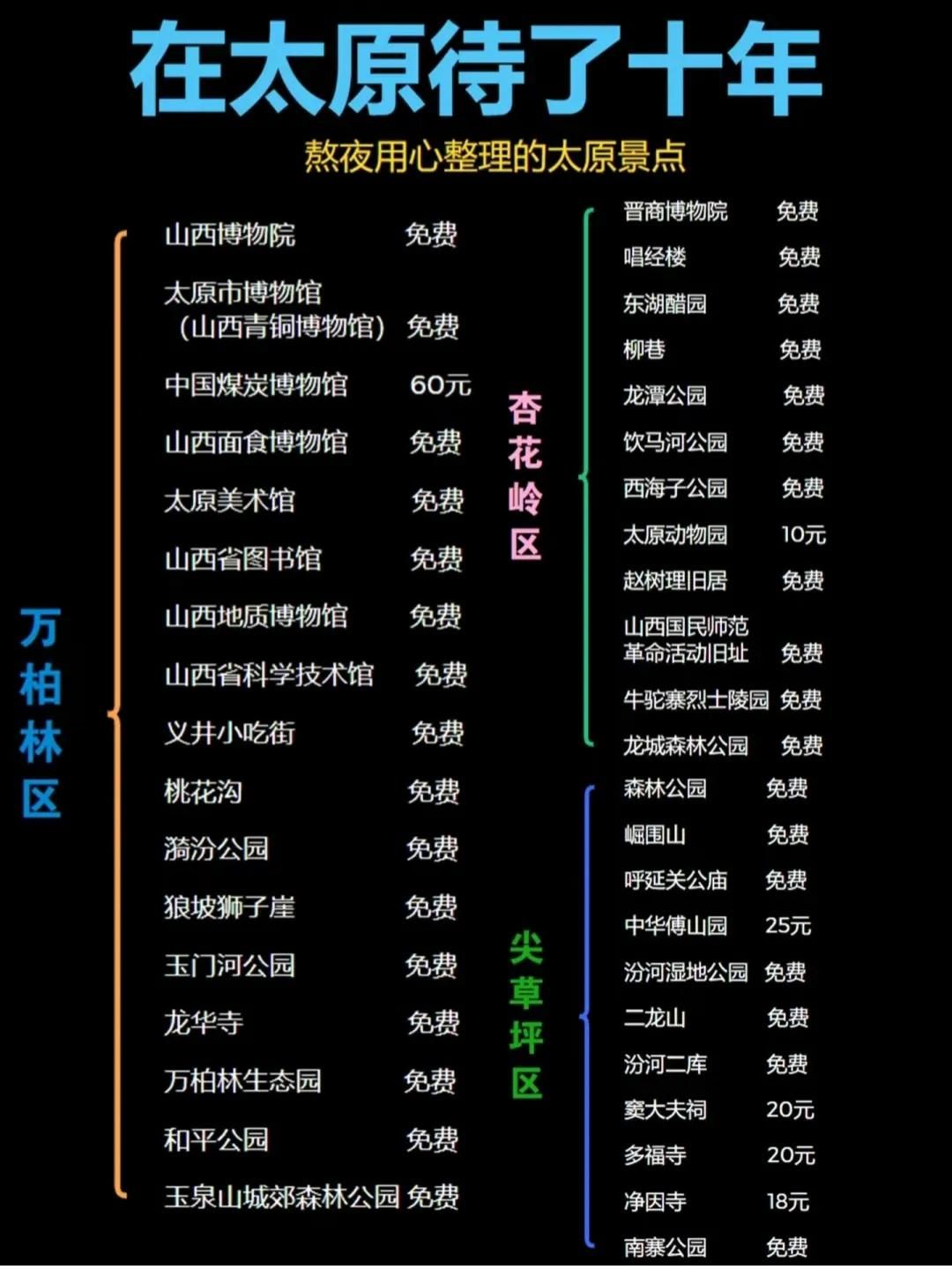 8. 汾河公园:是一座以汾河为主题的大型城市公园,公园内有汾河晚渡、生命之源、碧水沙滩、古韵广场、雁丘、晋汾古韵、五谷园、汾河湿地等景点。