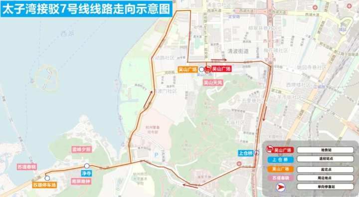 除了吴山广场沿线小区外,太子湾接驳7号线还途经上仓桥站点,太庙沿线的市民今后也可以乘坐太子湾接驳7号线直达西湖啦。